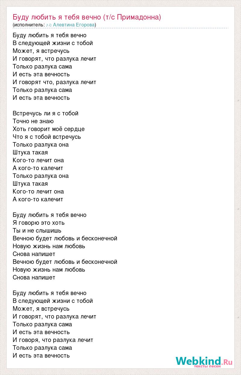 Буду любить я тебя вечно В следующей жизни с тобой Может, я встречусь И говорят, что разлука лечит Только разлука сама И есть эта вечность И говорят что, разлука лечит Только разлука сама И есть эта вечность Встречусь ли я с тобой Точно не знаю Хоть говорит моё сердце Что я с тобой встречусь Только разлука она Штука такая Кого-то лечит она А кого-то калечит Только разлука она Штука такая Кого-то лечит она А кого-то калечит Буду любить я тебя вечно Я говорю это хоть Ты и не слышишь Вечною будет любовь и бесконечной Новую жизнь нам любовь Снова напишет Вечною будет любовь и бесконечной Новую жизнь нам любовь Снова напишет Буду любить я тебя вечно В следующей жизни с тобой Может, я встречусь И говорят, что разлука лечит Только разлука сама И есть эта вечность И говоря, что разлука лечит Только разлука сама И есть эта вечность