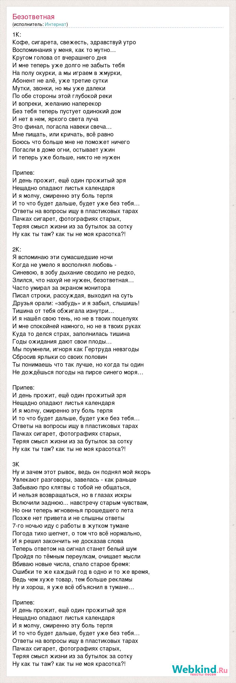 1К: Кофе, сигарета, свежесть, здравствуй утро Воспоминания у меня, как то мутно… Кругом голова от вчерашнего дня И мне теперь уже долго не забыть тебя На полу окурки, а мы играем в жмурки, Абонент не алё, уже третие сутки Мутки, звонки, но мы уже далеки По обе стороны этой глубокой реки И вопреки, желанию наперекор Без тебя теперь пустует одинокий дом И нет в нем, яркого света луча Это финал, погасла навеки свеча… Мне пищать, или кричать, всё равно Боюсь что больше мне не поможет ничего Погасли в доме огни, остывает ужин И теперь уже больше, никто не нужен Припев: И день прожит, ещё один прожитый зря Нещадно опадают листья календаря И я молчу, смиренно эту боль терпя И то что будет дальше, будет уже без тебя… Ответы на вопросы ищу в пластиковых тарах Пачках сигарет, фотографиях старых, Теряя смысл жизни из за бутылок за сотку Ну как ты там? как ты не моя красотка?! 2К: Я вспоминаю эти сумасшедшие ночи Когда не умело я восполнял любовь - Синевою, в зобу дыхание сводило не редко, Злился, что нахуй не нужен, безответная… Часто умирал за экраном монитора Писал строки, рассуждая, выходил на суть Друзья орали: «забудь» и я забыл, слышишь! Тишина от тебя обжигала изнутри… И я нашёл свою тень, но не в твоих поцелуях И мне спокойней намного, но не в твоих руках Куда то делся страх, заполнилась тишина Годы ожидания дают свои плоды… Мы поумнели, игноря как Гертруда невзгоды Сбросив ярлыки со своих половин Ты понимаешь что так лучше, но когда ты один Не дождёшься погоды на пирсе синего моря… Припев: И день прожит, ещё один прожитый зря Нещадно опадают листья календаря И я молчу, смиренно эту боль терпя И то что будет дальше, будет уже без тебя… Ответы на вопросы ищу в пластиковых тарах Пачках сигарет, фотографиях старых, Теряя смысл жизни из за бутылок за сотку Ну как ты там? как ты не моя красотка?! 3К Ну и зачем этот рывок, ведь он поднял мой якорь Увлекают разговоры, завелась - как раньше Забываю про клятвы с тобой не общаться, И нельзя возвращаться, но в глазах искры Включили заднюю... навстречу старым чувствам, Но они теперь мгновенья прошедшего лета Позже нет привета и не слышны ответы 7-го ночью иду с работы в жутком тумане Погода тихо шепчет, о том что всё нормально, И я решил закончить не досказав слова Теперь ответом на сигнал станет белый шум Пройдя по тёмным переулкам, очищает мысли Вбиваю новые числа, спало старое бремя: Ошибки те же каждый год в одно и то же время, Ведь чем хуже товар, тем больше рекламы Ну и хорош, я уже всё объяснил в тумане… Припев: И день прожит, ещё один прожитый зря Нещадно опадают листья календаря И я молчу, смиренно эту боль терпя И то что будет дальше, будет уже без тебя… Ответы на вопросы ищу в пластиковых тарах Пачках сигарет, фотографиях старых, Теряя смысл жизни из за бутылок за сотку Ну как ты там? как ты не моя красотка?!