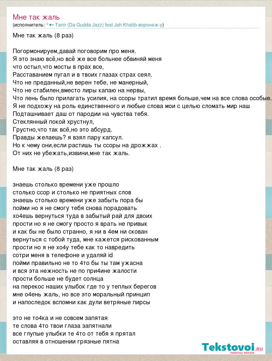 Мне так жаль (8 раз) Погормонируем,давай поговорим про меня. Я это знаю всё,но всё же все больнее обвиняй меня что остыл,что мосты в прах все, Расставанием пугал и в твоих глазах страх сеял. Что не преданный,не верен тебе, не манерный, Что не стабилен,вместо лиры капаю на нервы, Что лень было прилагать усилия, на ссоры тратил время больше,чем на все слова особые. Я не подхожу на роль единственного и любые слова мои с целью сломать мир наш Подташнивает даш от пародии на чувства тебя. Стеклянный покой хрустнул, Грустно,что так всё,но это абсурд. Правды желаешь? я взял пару капсул. Но к чему они,если растишь ты ссоры на дрожжах . От них не убежать,извини,мне так жаль. Мне так жаль (8 раз) знаешь столько времени уже прошло столько ссор и столько не приятных слов знаешь столько времени уже забыть пора бы пойми но я не смогу тебя снова порадовать хо4ешь вернуться туда в забытый рай для двоих прости но я не смогу просто я врать не привык и как бы не было странно, я ни в 4ем ни скован вернуться с тобой туда, мне кажется рискованным прости но я не хо4у тебе как то навредить сотри меня в телефоне и удаляй id пойми правильно не то 4то бы ты там ужасна и вся эта нежность не по при4ине жалости прости больше не будет солнца на перекос наших улыбок где то у теплых берегов мне о4ень жаль, но все это моральный принцип и напоследок вспомни как дули ветряные пирсы это не то4ка и не совсем запятая те слова 4то твои глаза запятнали все глупые улыбки те 4то от тебя я прятал оставляя в отношении грязные пятна