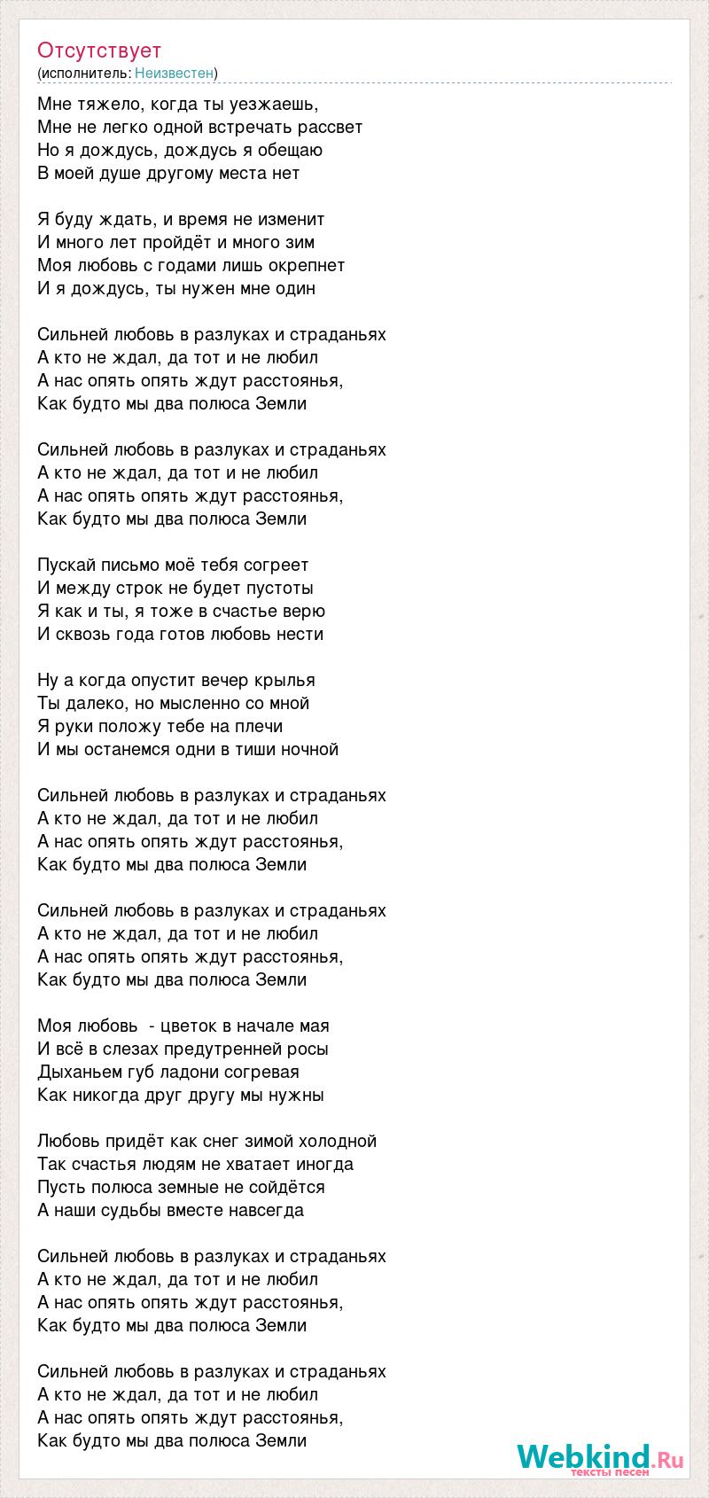 Мне тяжело, когда ты уезжаешь, Мне не легко одной встречать рассвет Но я дождусь, дождусь я обещаю В моей душе другому места нет Я буду ждать, и время не изменит И много лет пройдёт и много зим Моя любовь с годами лишь окрепнет И я дождусь, ты нужен мне один Сильней любовь в разлуках и страданьях А кто не ждал, да тот и не любил А нас опять опять ждут расстоянья, Как будто мы два полюса Земли Сильней любовь в разлуках и страданьях А кто не ждал, да тот и не любил А нас опять опять ждут расстоянья, Как будто мы два полюса Земли Пускай письмо моё тебя согреет И между строк не будет пустоты Я как и ты, я тоже в счастье верю И сквозь года готов любовь нести Ну а когда опустит вечер крылья Ты далеко, но мысленно со мной Я руки положу тебе на плечи И мы останемся одни в тиши ночной Сильней любовь в разлуках и страданьях А кто не ждал, да тот и не любил А нас опять опять ждут расстоянья, Как будто мы два полюса Земли Сильней любовь в разлуках и страданьях А кто не ждал, да тот и не любил А нас опять опять ждут расстоянья, Как будто мы два полюса Земли Моя любовь - цветок в начале мая И всё в слезах предутренней росы Дыханьем губ ладони согревая Как никогда друг другу мы нужны Любовь придёт как снег зимой холодной Так счастья людям не хватает иногда Пусть полюса земные не сойдётся А наши судьбы вместе навсегда Сильней любовь в разлуках и страданьях А кто не ждал, да тот и не любил А нас опять опять ждут расстоянья, Как будто мы два полюса Земли Сильней любовь в разлуках и страданьях А кто не ждал, да тот и не любил А нас опять опять ждут расстоянья, Как будто мы два полюса Земли