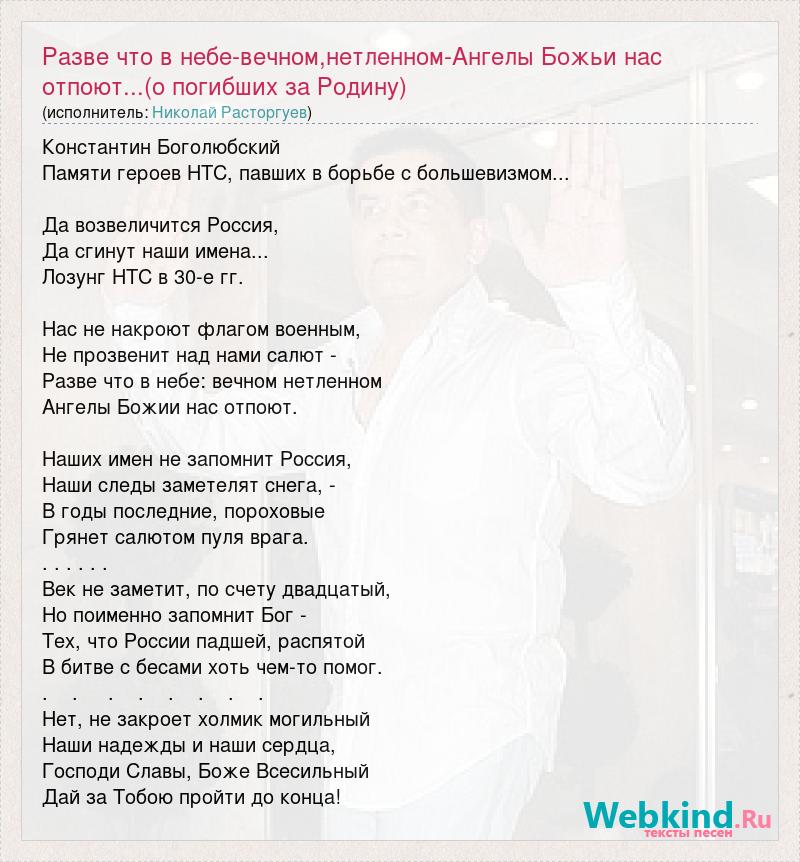 Главная→Исполнители→Николай Расторгуев→Разве что в небе-вечном,нетленном-Ангелы Божьи нас отпоют...(о погибших за