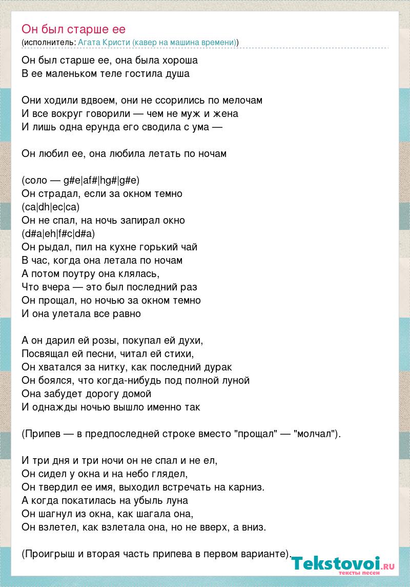 Он был старше ее, она была хороша В ее маленьком теле гостила душа Они ходили вдвоем, они не ссорились по мелочам И все вокруг говорили — чем не муж и жена И лишь одна ерунда его сводила с ума — Он любил ее, она любила летать по ночам (соло — g#e|af#|hg#|g#e) Он страдал, если за окном темно (ca|dh|ec|ca) Он не спал, на ночь запирал окно (d#a|eh|f#c|d#a) Он рыдал, пил на кухне горький чай В час, когда она летала по ночам А потом поутру она клялась, Что вчера — это был последний раз Он прощал, но ночью за окном темно И она улетала все равно А он дарил ей розы, покупал ей духи, Посвящал ей песни, читал ей стихи, Он хватался за нитку, как последний дурак Он боялся, что когда-нибудь под полной луной Она забудет дорогу домой И однажды ночью вышло именно так (Припев — в предпоследней строке вместо "прощал" — "молчал"). И три дня и три ночи он не спал и не ел, Он сидел у окна и на небо глядел, Он твердил ее имя, выходил встречать на карниз. А когда покатилась на убыль луна Он шагнул из окна, как шагала она, Он взлетел, как взлетала она, но не вверх, а вниз. (Проигрыш и вторая часть припева в первом варианте).