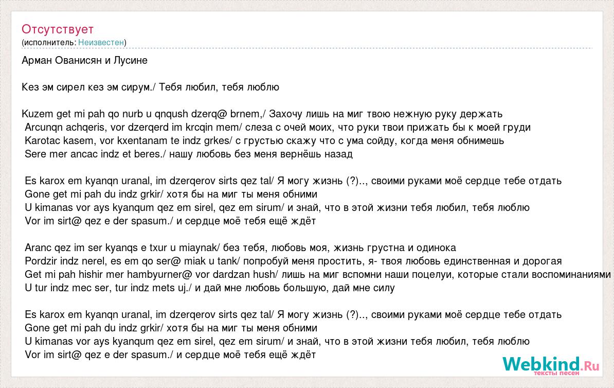 Арман Ованисян и Лусине Кез эм сирел кез эм сирум./ Тебя любил, тебя люблю Kuzem get mi pah qo nurb u qnqush dzerq@ brnem,/ Захочу лишь на миг твою нежную руку держать Arcunqn achqeris, vor dzerqerd im krcqin mem/ слеза с очей моих, что руки твои прижать бы к моей груди Karotac kasem, vor kxentanam te indz grkes/ с грустью скажу что с ума сойду, когда меня обнимешь Sere mer ancac indz et beres./ нашу любовь без меня вернёшь назад Es karox em kyanqn uranal, im dzerqerov sirts qez tal/ Я могу жизнь (?).., своими руками моё сердце тебе отдать Gone get mi pah du indz grkir/ хотя бы на миг ты меня обними U kimanas vor ays kyanqum qez em sirel, qez em sirum/ и знай, что в этой жизни тебя любил, тебя люблю Vor im sirt@ qez e der spasum./ и сердце моё тебя ещё ждёт Aranc qez im ser kyanqs e txur u miaynak/ без тебя, любовь моя, жизнь грустна и одинока Pordzir indz nerel, es em qo ser@ miak u tank/ попробуй меня простить, я- твоя любовь единственная и дорогая Get mi pah hishir mer hambyurner@ vor dardzan hush/ лишь на миг вспомни наши поцелуи, которые стали воспоминаниями U tur indz mec ser, tur indz mets uj./ и дай мне любовь большую, дай мне силу Es karox em kyanqn uranal, im dzerqerov sirts qez tal/ Я могу жизнь (?).., своими руками моё сердце тебе отдать Gone get mi pah du indz grkir/ хотя бы на миг ты меня обними U kimanas vor ays kyanqum qez em sirel, qez em sirum/ и знай, что в этой жизни тебя любил, тебя люблю Vor im sirt@ qez e der spasum./ и сердце моё тебя ещё ждёт
