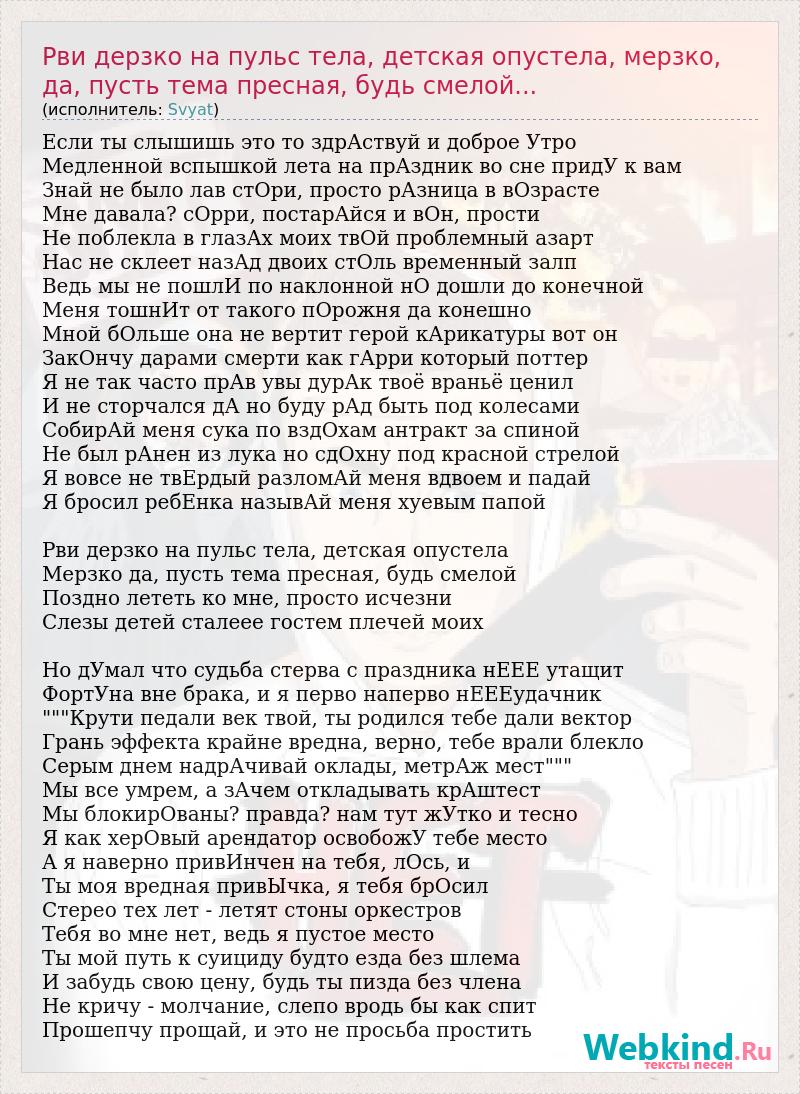 Если ты слышишь это то здрАствуй и доброе Утро Медленной вспышкой лета на прАздник во сне придУ к вам Знай не было лав стОри, просто рАзница в вОзрасте Мне давала? сОрри, постарАйся и вОн, прости Не поблекла в глазАх моих твОй проблемный азарт Нас не склеет назАд двоих стОль временный залп Ведь мы не пошлИ по наклонной нО дошли до конечной Меня тошнИт от такого пОрожня да конешно Мной бОльше она не вертит герой кАрикатуры вот он ЗакОнчу дарами смерти как гАрри который поттер Я не так часто прАв увы дурАк твоё враньё ценил И не сторчался дА но буду рАд быть под колесами СобирАй меня сука по вздОхам антракт за спиной Не был рАнен из лука но сдОхну под красной стрелой Я вовсе не твЕрдый разломАй меня вдвоем и падай Я бросил ребЕнка назывАй меня хуевым папой Рви дерзко на пульс тела, детская опустела Мерзко да, пусть тема пресная, будь смелой Поздно лететь ко мне, просто исчезни Слезы детей сталеее гостем плечей моих Но дУмал что судьба стерва с праздника нЕЕЕ утащит ФортУна вне брака, и я перво наперво нЕЕЕудачник """Крути педали век твой, ты родился тебе дали вектор Грань эффекта крайне вредна, верно, тебе врали блекло Серым днем надрАчивай оклады, метрАж мест""" Мы все умрем, а зАчем откладывать крАштест Мы блокирОваны? правда? нам тут жУтко и тесно Я как херОвый арендатор освобожУ тебе место А я наверно привИнчен на тебя, лОсь, и Ты моя вредная привЫчка, я тебя брОсил Стерео тех лет - летят стоны оркестров Тебя во мне нет, ведь я пустое место Ты мой путь к суициду будто езда без шлема И забудь свою цену, будь ты пизда без члена Не кричу - молчание, слепо вродь бы как спит Прошепчу прощай, и это не просьба простить