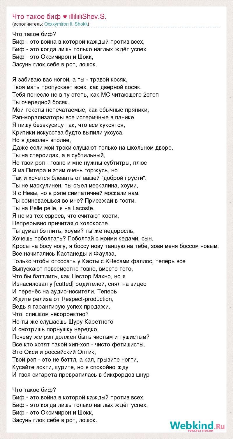 Что такое биф? Биф - это война в которой каждый против всех, Биф - это когда лишь только наглых ждёт успех. Биф - это Оксимирон и Шокк, Засунь глок себе в рот, лошок. Я забиваю вас ногой, а ты - травой косяк, Твоя мать пропускает всех, как дверной косяк. Тебя понесло не в ту степь, как MC читающего 2степ Ты очередной босяк. Мои тексты непечатаемые, как обычные пряники, Рэп-морализаторы все истеричные в панике, Я пишу безвкусицу так, что все куксятся, Критики искусства будто выпили уксуса. Но я доволен вполне, Даже если мои трэки слушают только на школьном дворе. Ты на стероидах, а я субтильный, Но твой рэп - говно и мне нужны субтитры, плюс Я из Питера и этим очень горжусь, но Так и хочется блевать от вашей "доброй грусти". Ты не маскулинен, ты съел мескалина, хоуми, Я с Невы, но в рэпе симпатичней москали нам. Ты сомневаешься во мне? Приезжай в гости. Ты на Pelle pelle, я на Lacoste. Я не из тех евреев, что считают кости, Непрерывно причитая о холокосте. Ты думал бэтлить, хоуми? ты же недоросль, Хочешь поболтать? Поболтай с моими кедами, сын. Кросы на босу ногу, я боссу нову танцую на тебе, зови меня боссом новым. Все начитались Кастанеды и Фаулза, Только чтобы отсосать у Касты с KRecами фаллос, теперь все Выпускают повсеместно говно, вместо того, Что бы бэттлить, как Нестор Махно, но я Изнасиловал у [cutted] родителей, снял на видео И перенёс на аудио-носители. Теперь Ждите релиза от Respect-production, Ведь я гарантирую успех продажи. Что, слишком некорректно? Но ты же слушаешь Шуру Каретного И смотришь порнушку нередко, Почему же рэп должен быть чистым и пушистым? Все кто хотят такой хип-хоп - чисто фетишисты. Это Окси и российский Оптик, Твой рэп - это не бэттл, а кал, грызите ногти, Кусайте локти, курите, но я спокойно жду И твоя сигарета превратилась в бикфордов шнур Что такое биф? Биф - это война в которой каждый против всех, Биф - это когда лишь только наглых ждёт успех. Биф - это Оксимирон и Шокк, Засунь глок себе в рот, лошок.