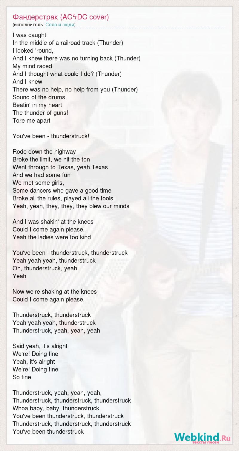 I was caught In the middle of a railroad track (Thunder) I looked 'round, And I knew there was no turning back (Thunder) My mind raced And I thought what could I do? (Thunder) And I knew There was no help, no help from you (Thunder) Sound of the drums Beatin' in my heart The thunder of guns! Tore me apart You've been - thunderstruck! Rode down the highway Broke the limit, we hit the ton Went through to Texas, yeah Texas And we had some fun We met some girls, Some dancers who gave a good time Broke all the rules, played all the fools Yeah, yeah, they, they, they blew our minds And I was shakin' at the knees Could I come again please. Yeah the ladies were too kind You've been - thunderstruck, thunderstruck Yeah yeah yeah, thunderstruck Oh, thunderstruck, yeah Yeah Now we're shaking at the knees Could I come again please. Thunderstruck, thunderstruck Yeah yeah yeah, thunderstruck Thunderstruck, yeah, yeah, yeah Said yeah, it's alright We're! Doing fine Yeah, it's alright We're! Doing fine So fine Thunderstruck, yeah, yeah, yeah, Thunderstruck, thunderstruck, thunderstruck Whoa baby, baby, thunderstruck You've been thunderstruck, thunderstruck Thunderstruck, thunderstruck, thunderstruck You've been thunderstruck