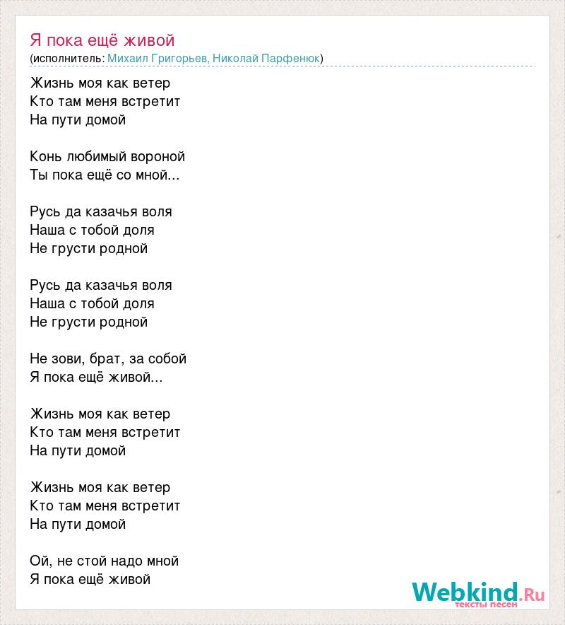 Жизнь моя как ветер Кто там меня встретит На пути домой Конь любимый вороной Ты пока ещё со мной... Русь да казачья воля Наша с тобой доля Не грусти родной Русь да казачья воля Наша с тобой доля Не грусти родной Не зови, брат, за собой Я пока ещё живой... Жизнь моя как ветер Кто там меня встретит На пути домой Жизнь моя как ветер Кто там меня встретит На пути домой Ой, не стой надо мной Я пока ещё живой