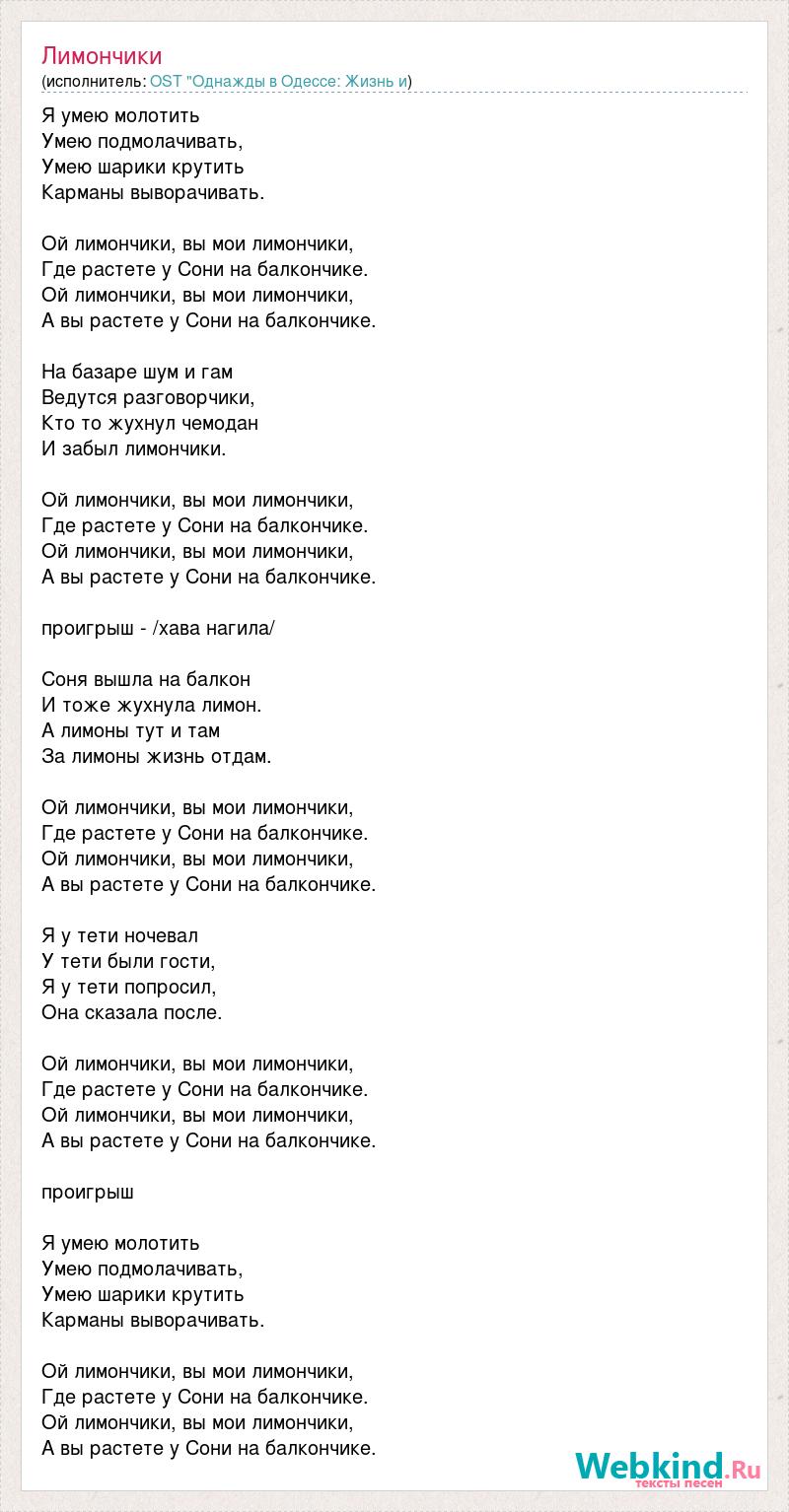 Я умею молотить Умею подмолачивать, Умею шарики крутить Карманы выворачивать. Ой лимончики, вы мои лимончики, Где растете у Сони на балкончике. Ой лимончики, вы мои лимончики, А вы растете у Сони на балкончике. На базаре шум и гам Ведутся разговорчики, Кто то жухнул чемодан И забыл лимончики. Ой лимончики, вы мои лимончики, Где растете у Сони на балкончике. Ой лимончики, вы мои лимончики, А вы растете у Сони на балкончике. проигрыш - /хава нагила/ Соня вышла на балкон И тоже жухнула лимон. А лимоны тут и там За лимоны жизнь отдам. Ой лимончики, вы мои лимончики, Где растете у Сони на балкончике. Ой лимончики, вы мои лимончики, А вы растете у Сони на балкончике. Я у тети ночевал У тети были гости, Я у тети попросил, Она сказала после. Ой лимончики, вы мои лимончики, Где растете у Сони на балкончике. Ой лимончики, вы мои лимончики, А вы растете у Сони на балкончике. проигрыш Я умею молотить Умею подмолачивать, Умею шарики крутить Карманы выворачивать. Ой лимончики, вы мои лимончики, Где растете у Сони на балкончике. Ой лимончики, вы мои лимончики, А вы растете у Сони на балкончике.
