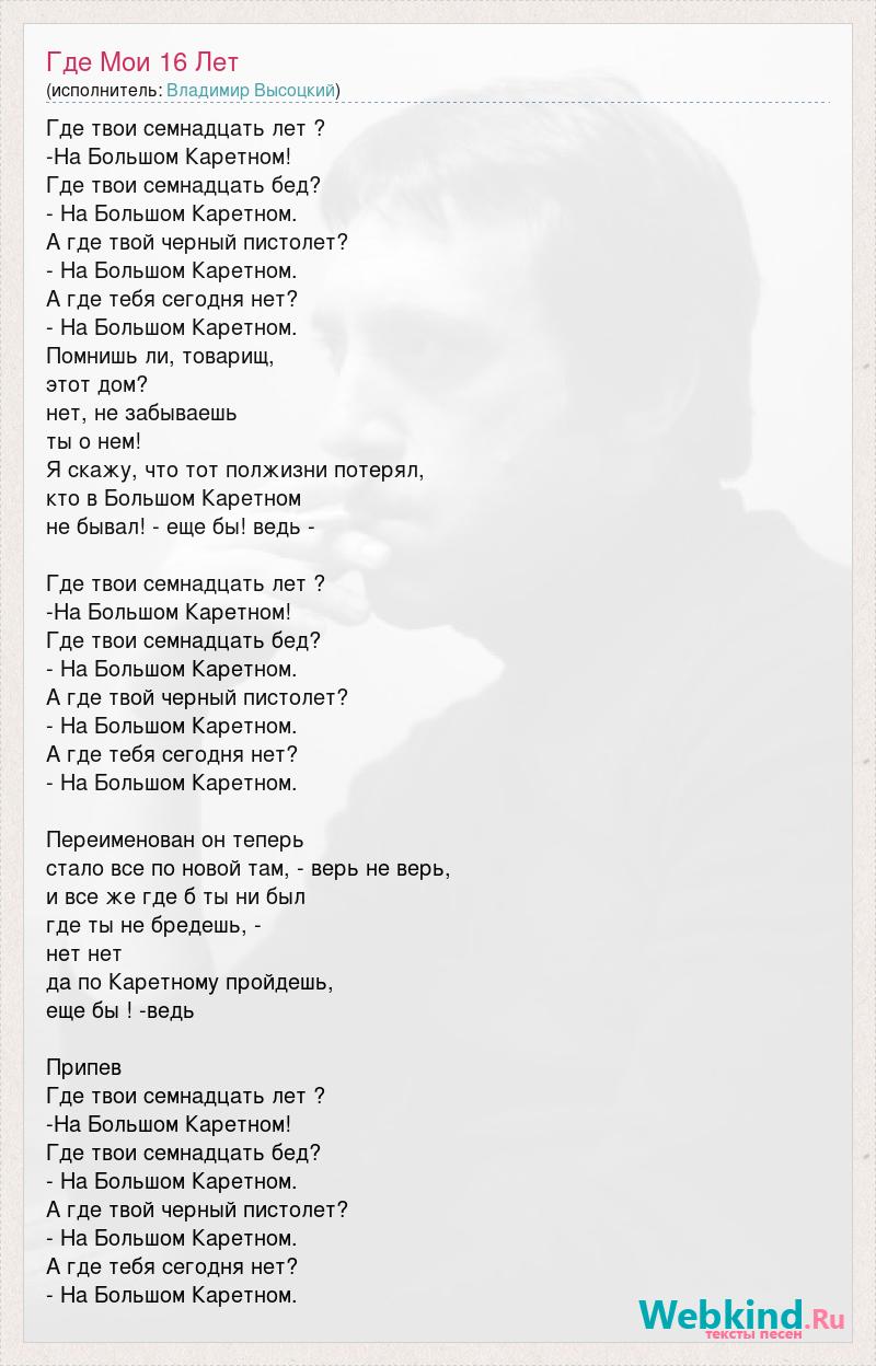 Где твои семнадцать лет ? -На Большом Каретном! Где твои семнадцать бед? - На Большом Каретном. А где твой черный пистолет? - На Большом Каретном. А где тебя сегодня нет? - На Большом Каретном. Помнишь ли, товарищ, этот дом? нет, не забываешь ты о нем! Я скажу, что тот полжизни потерял, кто в Большом Каретном не бывал! - еще бы! ведь - Где твои семнадцать лет ? -На Большом Каретном! Где твои семнадцать бед? - На Большом Каретном. А где твой черный пистолет? - На Большом Каретном. А где тебя сегодня нет? - На Большом Каретном. Переименован он теперь стало все по новой там, - верь не верь, и все же где б ты ни был где ты не бредешь, - нет нет да по Каретному пройдешь, еще бы ! -ведь Припев Где твои семнадцать лет ? -На Большом Каретном! Где твои семнадцать бед? - На Большом Каретном. А где твой черный пистолет? - На Большом Каретном. А где тебя сегодня нет? - На Большом Каретном.