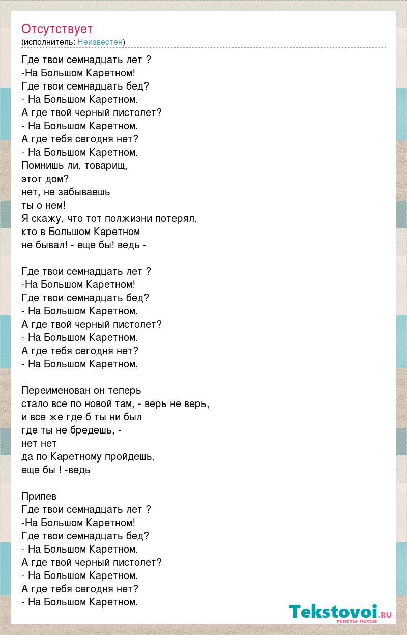 Где твои семнадцать лет ? -На Большом Каретном! Где твои семнадцать бед? - На Большом Каретном. А где твой черный пистолет? - На Большом Каретном. А где тебя сегодня нет? - На Большом Каретном. Помнишь ли, товарищ, этот дом? нет, не забываешь ты о нем! Я скажу, что тот полжизни потерял, кто в Большом Каретном не бывал! - еще бы! ведь - Где твои семнадцать лет ? -На Большом Каретном! Где твои семнадцать бед? - На Большом Каретном. А где твой черный пистолет? - На Большом Каретном. А где тебя сегодня нет? - На Большом Каретном. Переименован он теперь стало все по новой там, - верь не верь, и все же где б ты ни был где ты не бредешь, - нет нет да по Каретному пройдешь, еще бы ! -ведь Припев Где твои семнадцать лет ? -На Большом Каретном! Где твои семнадцать бед? - На Большом Каретном. А где твой черный пистолет? - На Большом Каретном. А где тебя сегодня нет? - На Большом Каретном.