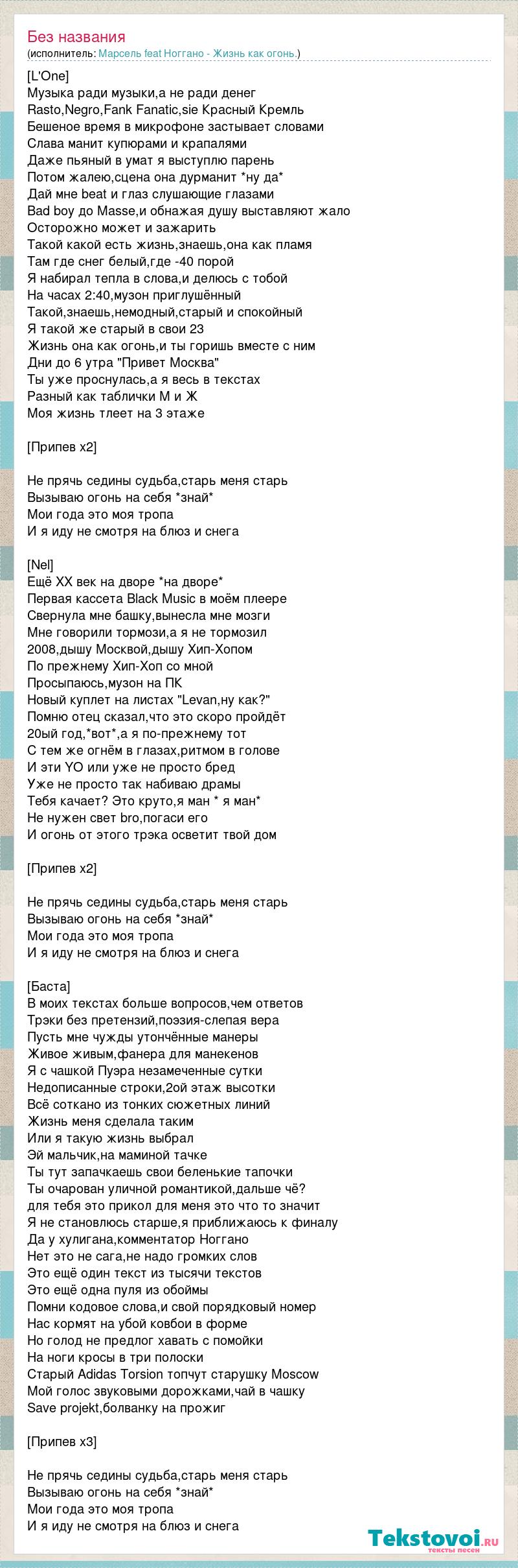 [L'One] Музыка ради музыки,а не ради денег Rasto,Negro,Fank Fanatic,sie Красный Кремль Бешеное время в микрофоне застывает словами Слава манит купюрами и крапалями Даже пьяный в умат я выступлю парень Потом жалею,сцена она дурманит *ну да* Дай мне beat и глаз слушающие глазами Bad boy до Masse,и обнажая душу выставляют жало Осторожно может и зажарить Такой какой есть жизнь,знаешь,она как пламя Там где снег белый,где -40 порой Я набирал тепла в слова,и делюсь с тобой На часах 2:40,музон приглушённый Такой,знаешь,немодный,старый и спокойный Я такой же старый в свои 23 Жизнь она как огонь,и ты горишь вместе с ним Дни до 6 утра "Привет Москва" Ты уже проснулась,а я весь в текстах Разный как таблички М и Ж Моя жизнь тлеет на 3 этаже [Припев х2] Не прячь седины судьба,старь меня старь Вызываю огонь на себя *знай* Мои года это моя тропа И я иду не смотря на блюз и снега [Nel] Ещё XX век на дворе *на дворе* Первая кассета Black Music в моём плеере Свернула мне башку,вынесла мне мозги Мне говорили тормози,а я не тормозил 2008,дышу Москвой,дышу Хип-Хопом По прежнему Хип-Хоп со мной Просыпаюсь,музон на ПК Новый куплет на листах "Levan,ну как?" Помню отец сказал,что это скоро пройдёт 20ый год,*вот*,а я по-прежнему тот С тем же огнём в глазах,ритмом в голове И эти YO или уже не просто бред Уже не просто так набиваю драмы Тебя качает? Это круто,я ман * я ман* Не нужен свет brо,погаси его И огонь от этого трэка осветит твой дом [Припев х2] Не прячь седины судьба,старь меня старь Вызываю огонь на себя *знай* Мои года это моя тропа И я иду не смотря на блюз и снега [Баста] В моих текстах больше вопросов,чем ответов Трэки без претензий,поэзия-слепая вера Пусть мне чужды утончённые манеры Живое живым,фанера для манекенов Я с чашкой Пуэра незамеченные сутки Недописанные строки,2ой этаж высотки Всё соткано из тонких сюжетных линий Жизнь меня сделала таким Или я такую жизнь выбрал Эй мальчик,на маминой тачке Ты тут запачкаешь свои беленькие тапочки Ты очарован уличной романтикой,дальше чё? для тебя это прикол для меня это что то значит Я не становлюсь старше,я приближаюсь к финалу Да у хулигана,комментатор Ноггано Нет это не сага,не надо громких слов Это ещё один текст из тысячи текстов Это ещё одна пуля из обоймы Помни кодовое слова,и свой порядковый номер Нас кормят на убой ковбои в форме Но голод не предлог хавать с помойки На ноги кросы в три полоски Старый Adidas Torsion топчут старушку Moscow Мой голос звуковыми дорожками,чай в чашку Save projekt,болванку на прожиг [Припев х3] Не прячь седины судьба,старь меня старь Вызываю огонь на себя *знай* Мои года это моя тропа И я иду не смотря на блюз и снега