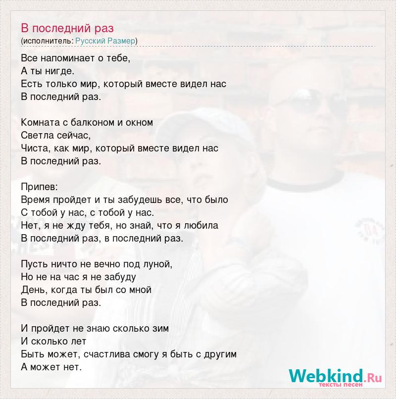 Все напоминает о тебе, А ты нигде. Есть только мир, который вместе видел нас В последний раз. Комната с балконом и окном Светла сейчас, Чиста, как мир, который вместе видел нас В последний раз. Припев: Время пройдет и ты забудешь все, что было С тобой у нас, с тобой у нас. Нет, я не жду тебя, но знай, что я любила В последний раз, в последний раз. Пусть ничто не вечно под луной, Но не на час я не забуду День, когда ты был со мной В последний раз. И пройдет не знаю сколько зим И сколько лет Быть может, счастлива смогу я быть с другим А может нет.