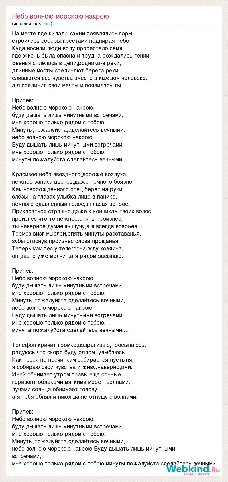 На месте,где кидали камни появлялись горы, строились соборы,крестами подпирая небо. Куда носили люди воду,прорастало семя, где жизнь была опасна и трудна рождались гении. Звенья сплелись в цепи,родники-в реки, длинные мосты соединяют берега реки, сливаются все чувства вместе в каждом человеке, а я соединил свои мечты и появилась ты. Припев: Небо волною морскою накрою, буду дышать лишь минутными встречами, мне хорошо только рядом с тобою. Минуты,пожалуйста,сделайтесь вечными, небо волною морскою накрою. Буду дышать лишь минутными встречами, мне хорошо только рядом с тобою, минуты,пожалуйста,сделайтесь вечными.... Красивее неба звездного,дороже воздуха, нежнее запаха цветов,даже немного боязно. Как новорожденного отец берет на руки, слёзы на глазах,улыбка,лицо в панике, немного сдавленный голос,в глазах вопрос. Прикасаться страшно даже к кончикам твоих волос, произнес что-то нежное,опять произнес, ты наверное думаешь шучу,а я всегда всерьез. Тормоз,визг мыслей,опять минуты расставанья, зубы стиснув,произнес слова прощанья. Теперь как пес у телефона жду хозяина, он давно уже молчит,а я рядом засыпаю. Припев: Небо волною морскою накрою, буду дышать лишь минутными встречами, мне хорошо только рядом с тобою. Минуты,пожалуйста,сделайтесь вечными, небо волною морскою накрою. Буду дышать лишь минутными встречами, мне хорошо только рядом с тобою, минуты,пожалуйста,сделайтесь вечными.... Телефон кричит громко,вздрагиваю,просыпаюсь, радуюсь,что скоро буду рядом, улыбаюсь. Как песок по песчинкам собирается пустыня, я собираю свои чувства и живу,наверно,ими. Иней обнимает утром травы еще сонные, горизонт облаками мягкими,море - волнами, лучами солнца обнимает голову, а я тебя обнял и никогда не отпущу с волнами. Припев: Небо волною морскою накрою, буду дышать лишь минутными встречами, мне хорошо только рядом с тобою. Минуты,пожалуйста,сделайтесь вечными, небо волною морскою накрою.Буду дышать лишь минутными встречами, мне хорошо только рядом с тобою,минуты,пожалуйста,сделайтесь вечными....