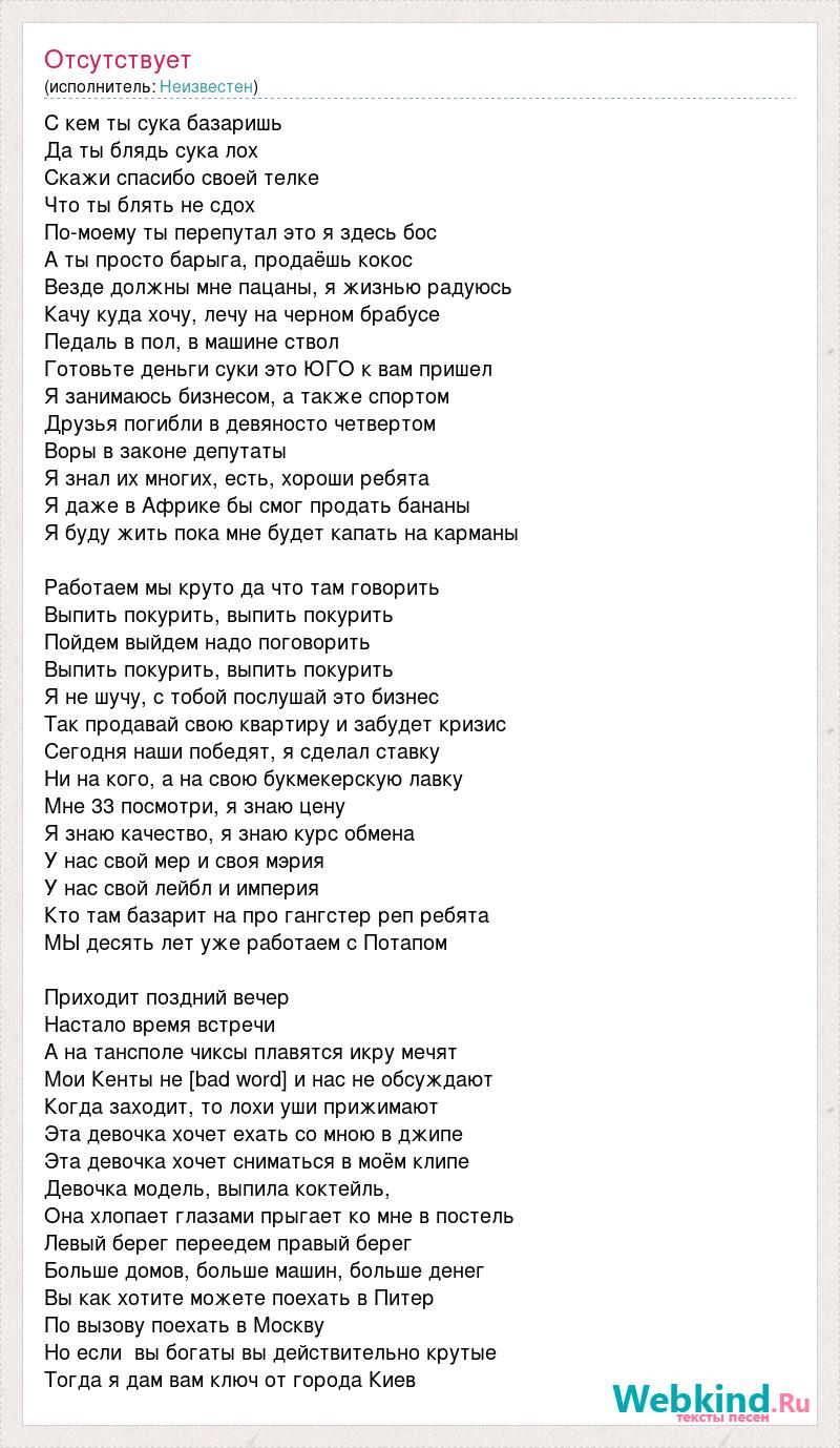 С кем ты сука базаришь Да ты блядь сука лох Скажи спасибо своей телке Что ты блять не сдох По-моему ты перепутал это я здесь бос А ты просто барыга, продаёшь кокос Везде должны мне пацаны, я жизнью радуюсь Качу куда хочу, лечу на черном брабусе Педаль в пол, в машине ствол Готовьте деньги суки это ЮГО к вам пришел Я занимаюсь бизнесом, а также спортом Друзья погибли в девяносто четвертом Воры в законе депутаты Я знал их многих, есть, хороши ребята Я даже в Африке бы смог продать бананы Я буду жить пока мне будет капать на карманы Работаем мы круто да что там говорить Выпить покурить, выпить покурить Пойдем выйдем надо поговорить Выпить покурить, выпить покурить Я не шучу, с тобой послушай это бизнес Так продавай свою квартиру и забудет кризис Сегодня наши победят, я сделал ставку Ни на кого, а на свою букмекерскую лавку Мне 33 посмотри, я знаю цену Я знаю качество, я знаю курс обмена У нас свой мер и своя мэрия У нас свой лейбл и империя Кто там базарит на про гангстер реп ребята МЫ десять лет уже работаем с Потапом Приходит поздний вечер Настало время встречи А на тансполе чиксы плавятся икру мечят Мои Кенты не [bad word] и нас не обсуждают Когда заходит, то лохи уши прижимают Эта девочка хочет ехать со мною в джипе Эта девочка хочет сниматься в моём клипе Девочка модель, выпила коктейль, Она хлопает глазами прыгает ко мне в постель Левый берег переедем правый берег Больше домов, больше машин, больше денег Вы как хотите можете поехать в Питер По вызову поехать в Москву Но если вы богаты вы действительно крутые Тогда я дам вам ключ от города Киев
