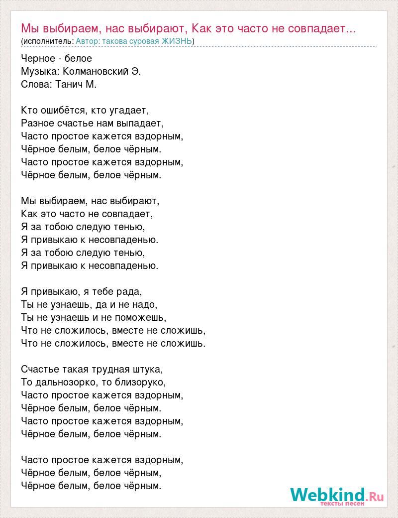 Черное - белое Музыка: Колмановский Э. Слова: Танич М. Кто ошибётся, кто угадает, Разное счастье нам выпадает, Часто простое кажется вздорным, Чёрное белым, белое чёрным. Часто простое кажется вздорным, Чёрное белым, белое чёрным. Мы выбираем, нас выбирают, Как это часто не совпадает, Я за тобою следую тенью, Я привыкаю к несовпаденью. Я за тобою следую тенью, Я привыкаю к несовпаденью. Я привыкаю, я тебе рада, Ты не узнаешь, да и не надо, Ты не узнаешь и не поможешь, Что не сложилось, вместе не сложишь, Что не сложилось, вместе не сложишь. Счастье такая трудная штука, То дальнозорко, то близоруко, Часто простое кажется вздорным, Чёрное белым, белое чёрным. Часто простое кажется вздорным, Чёрное белым, белое чёрным. Часто простое кажется вздорным, Чёрное белым, белое чёрным, Чёрное белым, белое чёрным.