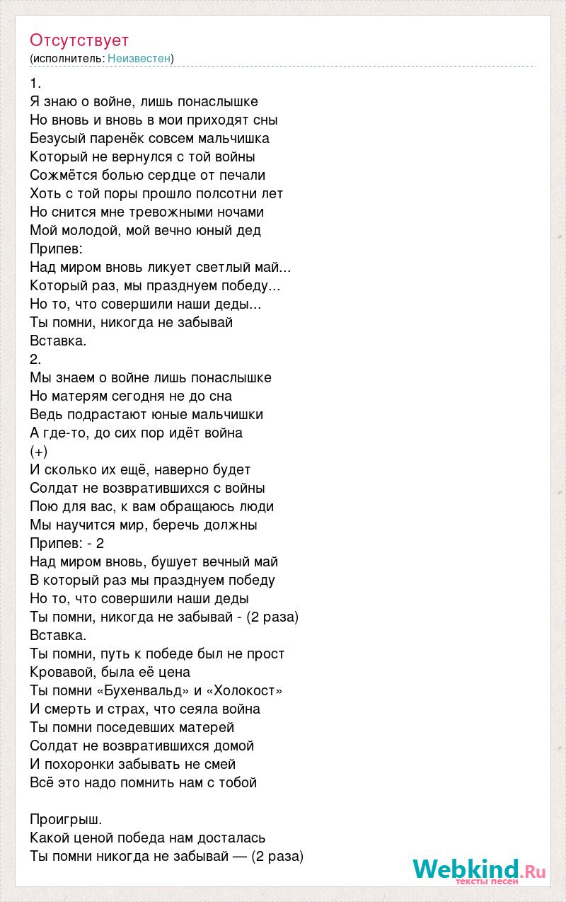 1. Я знаю о войне, лишь понаслышке Но вновь и вновь в мои приходят сны Безусый паренёк совсем мальчишка Который не вернулся с той войны Сожмётся болью сердце от печали Хоть с той поры прошло полсотни лет Но снится мне тревожными ночами Мой молодой, мой вечно юный дед Припев: Над миром вновь ликует светлый май... Который раз, мы празднуем победу... Но то, что совершили наши деды... Ты помни, никогда не забывай Вставка. 2. Мы знаем о войне лишь понаслышке Но матерям сегодня не до сна Ведь подрастают юные мальчишки А где-то, до сих пор идёт война (+) И сколько их ещё, наверно будет Солдат не возвратившихся с войны Пою для вас, к вам обращаюсь люди Мы научится мир, беречь должны Припев: - 2 Над миром вновь, бушует вечный май В который раз мы празднуем победу Но то, что совершили наши деды Ты помни, никогда не забывай - (2 раза) Вставка. Ты помни, путь к победе был не прост Кровавой, была её цена Ты помни «Бухенвальд» и «Холокост» И смерть и страх, что сеяла война Ты помни поседевших матерей Солдат не возвратившихся домой И похоронки забывать не смей Всё это надо помнить нам с тобой Проигрыш. Какой ценой победа нам досталась Ты помни никогда не забывай — (2 раза)