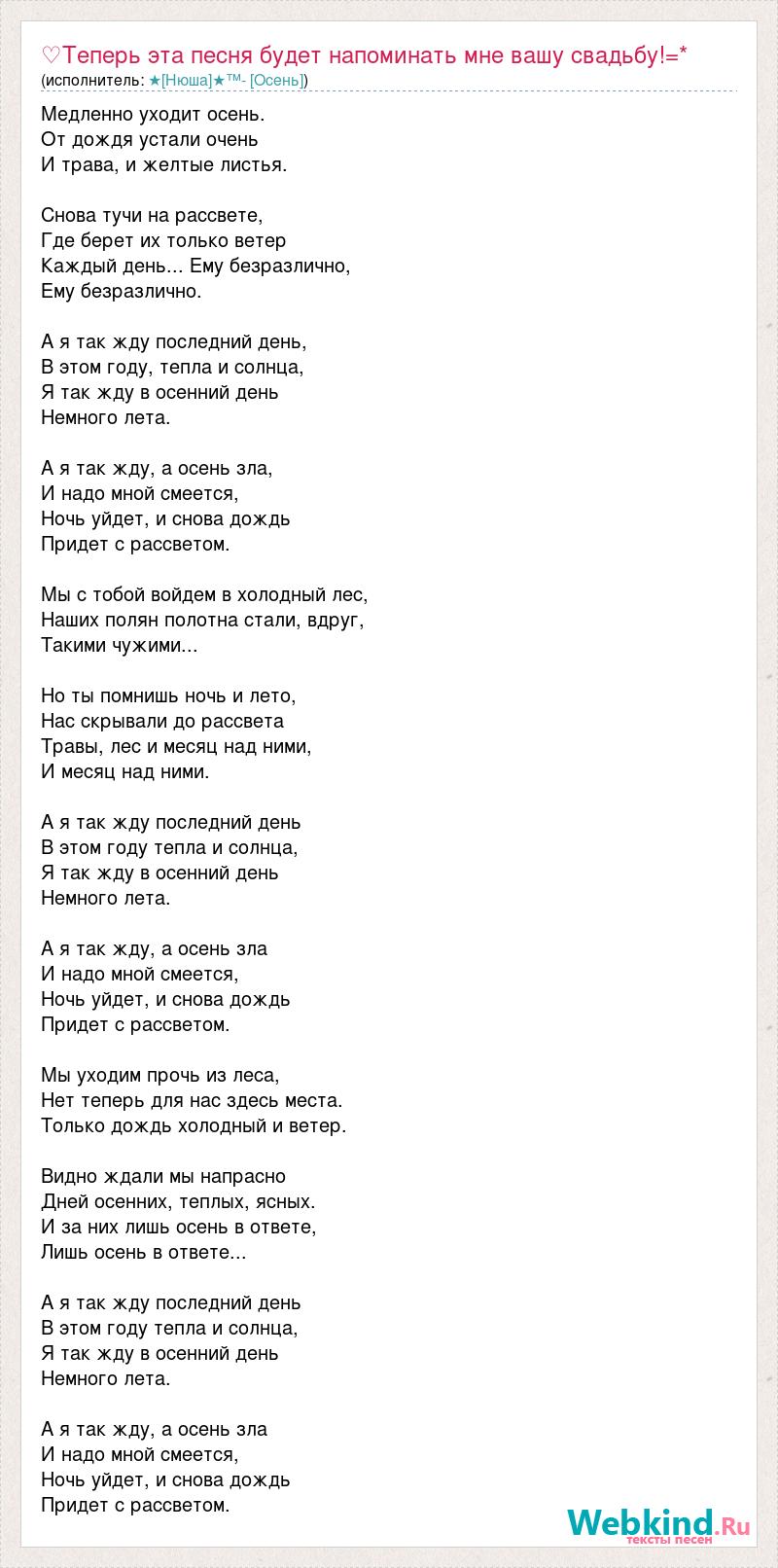 Медленно уходит осень. От дождя устали очень И трава, и желтые листья. Снова тучи на рассвете, Где берет их только ветер Каждый день... Ему безразлично, Ему безразлично. А я так жду последний день, В этом году, тепла и солнца, Я так жду в осенний день Немного лета. А я так жду, а осень зла, И надо мной смеется, Ночь уйдет, и снова дождь Придет с рассветом. Мы с тобой войдем в холодный лес, Наших полян полотна стали, вдруг, Такими чужими... Но ты помнишь ночь и лето, Нас скрывали до рассвета Травы, лес и месяц над ними, И месяц над ними. А я так жду последний день В этом году тепла и солнца, Я так жду в осенний день Немного лета. А я так жду, а осень зла И надо мной смеется, Ночь уйдет, и снова дождь Придет с рассветом. Мы уходим прочь из леса, Нет теперь для нас здесь места. Только дождь холодный и ветер. Видно ждали мы напрасно Дней осенних, теплых, ясных. И за них лишь осень в ответе, Лишь осень в ответе... А я так жду последний день В этом году тепла и солнца, Я так жду в осенний день Немного лета. А я так жду, а осень зла И надо мной смеется, Ночь уйдет, и снова дождь Придет с рассветом.