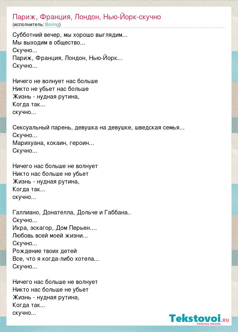 Субботний вечер, мы хорошо выглядим... Мы выходим в общество... Скучно... Париж, Франция, Лондон, Нью-Йорк... Скучно... Ничего не волнует нас больше Никто не убьет нас больше Жизнь - нудная рутина, Когда так... скучно... Сексуальный парень, девушка на девушке, шведская семья... Скучно... Марихуана, кокаин, героин... Скучно... Ничего нас больше не волнует Никто нас больше не убьет Жизнь - нудная рутина, Когда так... скучно... Галлиано, Донателла, Дольче и Габбана.. Скучно... Икра, эскагор, Дом Перьен.... Любовь всей моей жизни... Скучно... Рождение твоих детей Все, что я когда-либо хотела... Скучно... Ничего нас больше не волнует Никто нас больше не убьет Жизнь - нудная рутина, Когда так... скучно...