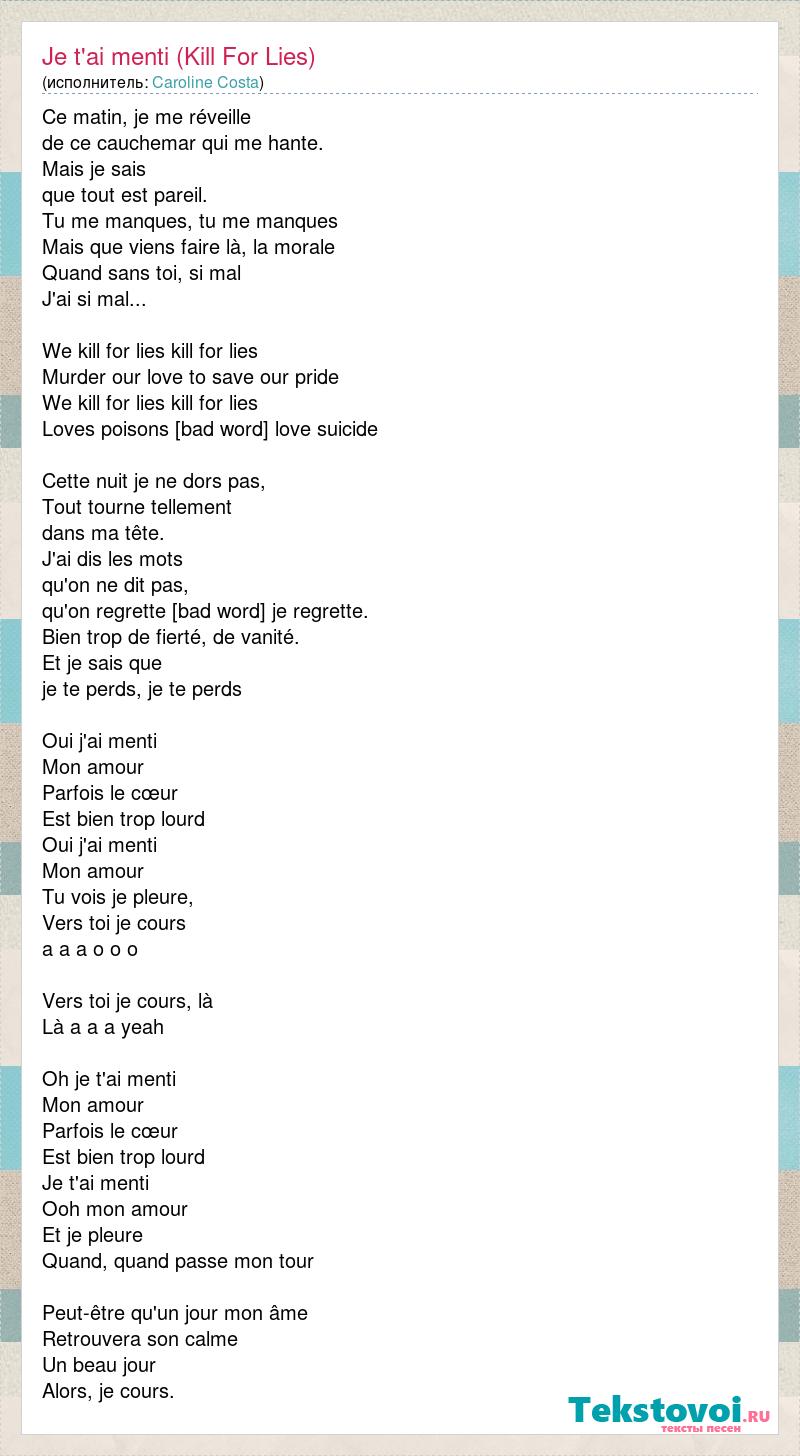 Ce matin, je me réveille de ce cauchemar qui me hante. Mais je sais que tout est pareil. Tu me manques, tu me manques Mais que viens faire là, la morale Quand sans toi, si mal J'ai si mal... We kill for lies kill for lies Murder our love to save our pride We kill for lies kill for lies Loves poisons truth love suicide Cette nuit je ne dors pas, Tout tourne tellement dans ma tête. J'ai dis les mots qu'on ne dit pas, qu'on regrette comme je regrette. Bien trop de fierté, de vanité. Et je sais que je te perds, je te perds Oui j'ai menti Mon amour Parfois le cœur Est bien trop lourd Oui j'ai menti Mon amour Tu vois je pleure, Vers toi je cours a a a o o o Vers toi je cours, là Là a a a yeah Oh je t'ai menti Mon amour Parfois le cœur Est bien trop lourd Je t'ai menti Ooh mon amour Et je pleure Quand, quand passe mon tour Peut-être qu'un jour mon âme Retrouvera son calme Un beau jour Alors, je cours.