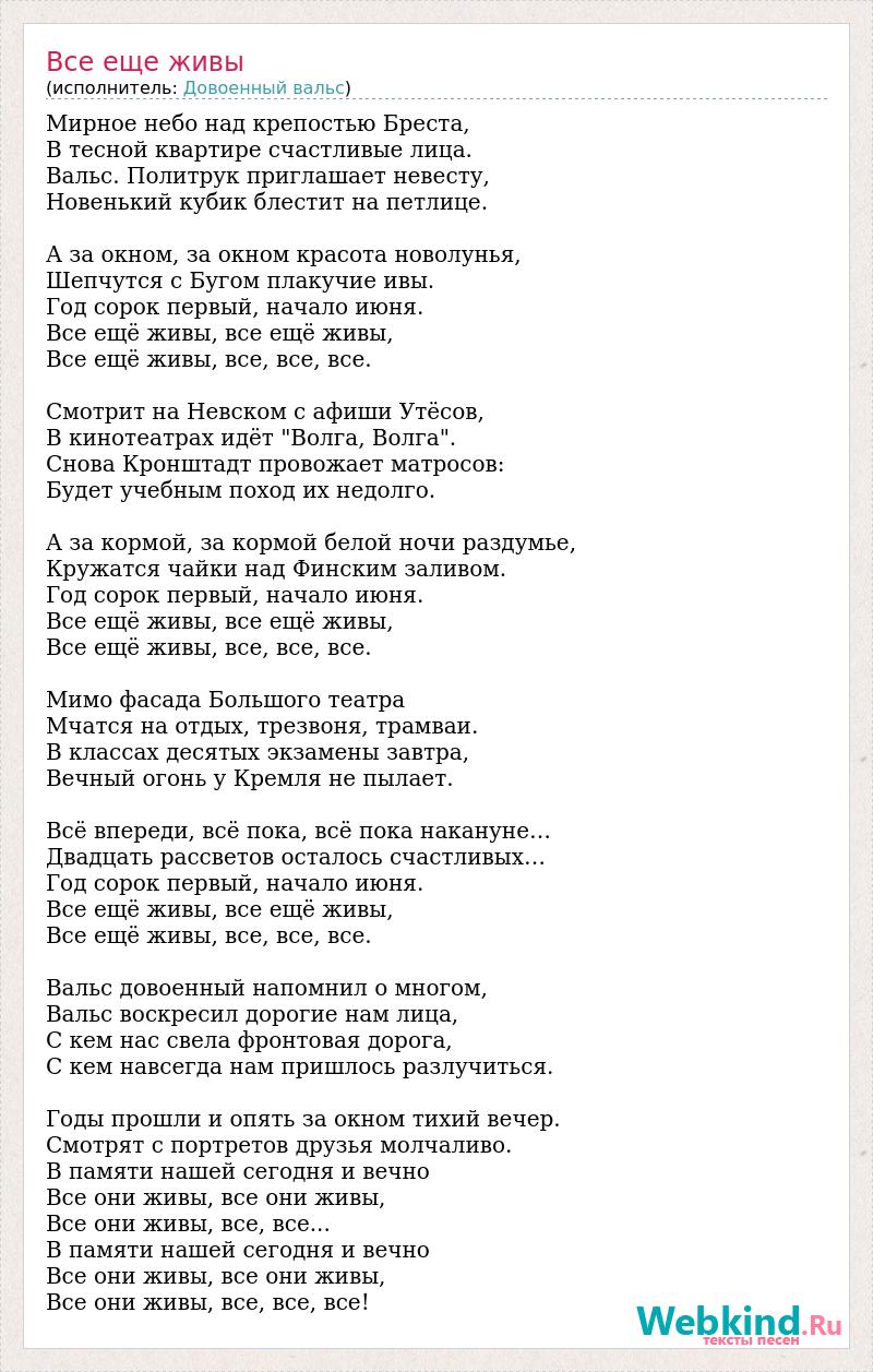Мирное небо над крепостью Бреста, В тесной квартире счастливые лица. Вальс. Политрук приглашает невесту, Новенький кубик блестит на петлице. А за окном, за окном красота новолунья, Шепчутся с Бугом плакучие ивы. Год сорок первый, начало июня. Все ещё живы, все ещё живы, Все ещё живы, все, все, все. Смотрит на Невском с афиши Утёсов, В кинотеатрах идёт "Волга, Волга". Снова Кронштадт провожает матросов: Будет учебным поход их недолго. А за кормой, за кормой белой ночи раздумье, Кружатся чайки над Финским заливом. Год сорок первый, начало июня. Все ещё живы, все ещё живы, Все ещё живы, все, все, все. Мимо фасада Большого театра Мчатся на отдых, трезвоня, трамваи. В классах десятых экзамены завтра, Вечный огонь у Кремля не пылает. Всё впереди, всё пока, всё пока накануне… Двадцать рассветов осталось счастливых… Год сорок первый, начало июня. Все ещё живы, все ещё живы, Все ещё живы, все, все, все. Вальс довоенный напомнил о многом, Вальс воскресил дорогие нам лица, С кем нас свела фронтовая дорога, С кем навсегда нам пришлось разлучиться. Годы прошли и опять за окном тихий вечер. Смотрят с портретов друзья молчаливо. В памяти нашей сегодня и вечно Все они живы, все они живы, Все они живы, все, все... В памяти нашей сегодня и вечно Все они живы, все они живы, Все они живы, все, все, все!