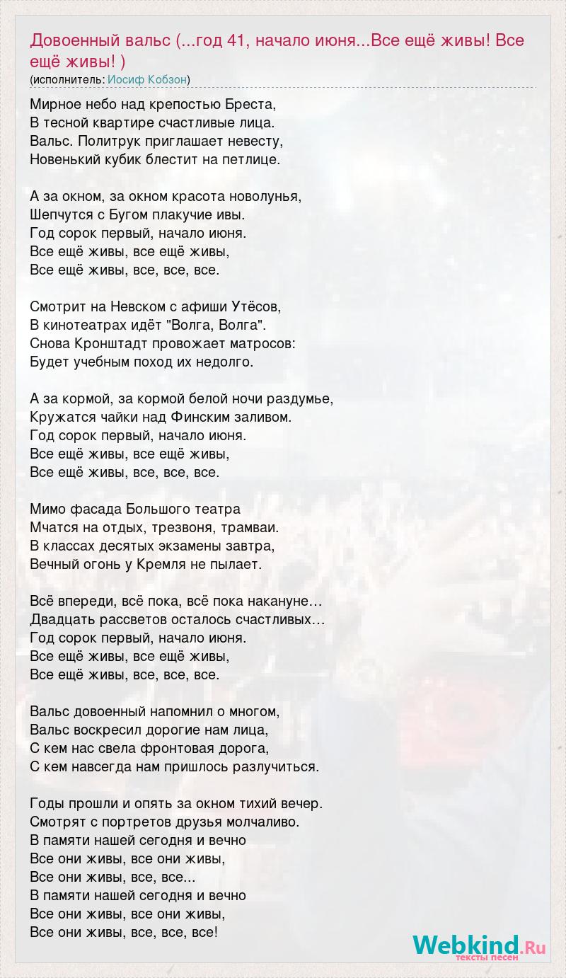 Мирное небо над крепостью Бреста, В тесной квартире счастливые лица. Вальс. Политрук приглашает невесту, Новенький кубик блестит на петлице. А за окном, за окном красота новолунья, Шепчутся с Бугом плакучие ивы. Год сорок первый, начало июня. Все ещё живы, все ещё живы, Все ещё живы, все, все, все. Смотрит на Невском с афиши Утёсов, В кинотеатрах идёт "Волга, Волга". Снова Кронштадт провожает матросов: Будет учебным поход их недолго. А за кормой, за кормой белой ночи раздумье, Кружатся чайки над Финским заливом. Год сорок первый, начало июня. Все ещё живы, все ещё живы, Все ещё живы, все, все, все. Мимо фасада Большого театра Мчатся на отдых, трезвоня, трамваи. В классах десятых экзамены завтра, Вечный огонь у Кремля не пылает. Всё впереди, всё пока, всё пока накануне… Двадцать рассветов осталось счастливых… Год сорок первый, начало июня. Все ещё живы, все ещё живы, Все ещё живы, все, все, все. Вальс довоенный напомнил о многом, Вальс воскресил дорогие нам лица, С кем нас свела фронтовая дорога, С кем навсегда нам пришлось разлучиться. Годы прошли и опять за окном тихий вечер. Смотрят с портретов друзья молчаливо. В памяти нашей сегодня и вечно Все они живы, все они живы, Все они живы, все, все... В памяти нашей сегодня и вечно Все они живы, все они живы, Все они живы, все, все, все!