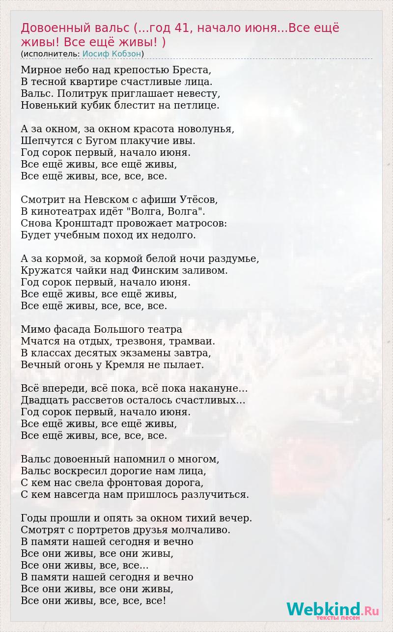 Мирное небо над крепостью Бреста, В тесной квартире счастливые лица. Вальс. Политрук приглашает невесту, Новенький кубик блестит на петлице. А за окном, за окном красота новолунья, Шепчутся с Бугом плакучие ивы. Год сорок первый, начало июня. Все ещё живы, все ещё живы, Все ещё живы, все, все, все. Смотрит на Невском с афиши Утёсов, В кинотеатрах идёт "Волга, Волга". Снова Кронштадт провожает матросов: Будет учебным поход их недолго. А за кормой, за кормой белой ночи раздумье, Кружатся чайки над Финским заливом. Год сорок первый, начало июня. Все ещё живы, все ещё живы, Все ещё живы, все, все, все. Мимо фасада Большого театра Мчатся на отдых, трезвоня, трамваи. В классах десятых экзамены завтра, Вечный огонь у Кремля не пылает. Всё впереди, всё пока, всё пока накануне… Двадцать рассветов осталось счастливых… Год сорок первый, начало июня. Все ещё живы, все ещё живы, Все ещё живы, все, все, все. Вальс довоенный напомнил о многом, Вальс воскресил дорогие нам лица, С кем нас свела фронтовая дорога, С кем навсегда нам пришлось разлучиться. Годы прошли и опять за окном тихий вечер. Смотрят с портретов друзья молчаливо. В памяти нашей сегодня и вечно Все они живы, все они живы, Все они живы, все, все... В памяти нашей сегодня и вечно Все они живы, все они живы, Все они живы, все, все, все!