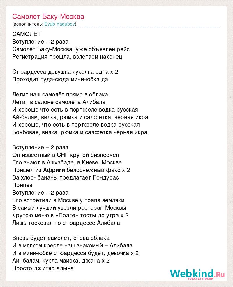 САМОЛЁТ Вступление – 2 раза Самолёт Баку-Москва, уже объявлен рейс Регистрация прошла, взлетаем наконец Стюардесса-девушка куколка одна х 2 Проходит туда-сюда мини-юбка да Летит наш самолёт прямо в облака Летит в салоне самолёта Алибала И хорошо что есть в портфеле водка русская Ай-балам, вилка, рюмка и салфетка, чёрная икра И хорошо, что есть в портфеле водка русская Бомбовая, вилка ,рюмка и салфетка чёрная икра Вступление – 2 раза Он известный в СНГ крутой бизнесмен Его знают в Ашхабаде, в Киеве, Москве Пришёл из Африки белоснежный факс х 2 За хлор- бананы предлагает Гондурас Припев Вступление – 2 раза Его встретили в Москве у трапа земляки В самый лучший увезли ресторан Москвы Крутою меню в «Праге» тосты до утра х 2 Лишь тосковал по стюардессе Алибала Вновь будет самолёт, снова облака И в мягком кресле наш знакомый – Алибала И в мини-юбке стюардесса будет, девочка х 2 Ай, балам, кукла майска, джана х 2 Просто джигяр адына