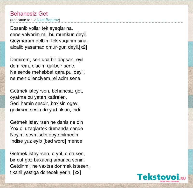 Dosenib yollar tek ayaqlarina, sene yalvarim mi, bu mumkun deyil. Qoymaram qelbim tek vuqarim sina, alcalib yasamaq omur-gun deyil.[x2] Demirem, sen uca bir dagsan, eyil demirem, elacim qalibdir sene. Ne sende mehebbet qara pul deyil, ne men dilenciyem, el acim sene. Getmek isteyirsen, behanesiz get, oyatma bu yatan xatireleri. Sesi hemin sesdir, baxisin ogey, gedirsen sesin de yad olsun, indi. Getmek isteyirsen ne danis ne din Yox ol uzaglartek dumanda cende Neyimi sevmisdin deye bilmedin Indise yuz eyib gorursen mende Getmek isteyirsen, o yol, o da sen, bir cut goz baxacaq arxanca senin. Getdinmi, ne vaxtsa donmek istesen, tikanli yastiga donecek yerin. [x2]
