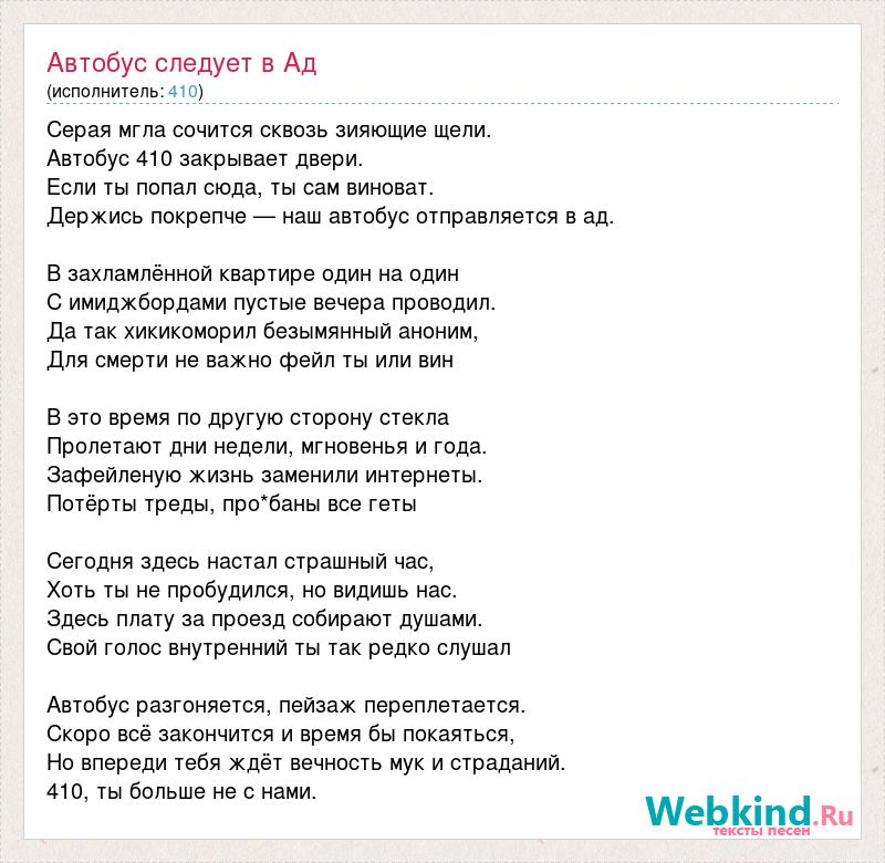 Серая мгла сочится сквозь зияющие щели. Автобус 410 закрывает двери. Если ты попал сюда, ты сам виноват. Держись покрепче — наш автобус отправляется в ад. В захламлённой квартире один на один С имиджбордами пустые вечера проводил. Да так хикикоморил безымянный аноним, Для смерти не важно фейл ты или вин В это время по другую сторону стекла Пролетают дни недели, мгновенья и года. Зафейленую жизнь заменили интернеты. Потёрты треды, про*баны все геты Сегодня здесь настал страшный час, Хоть ты не пробудился, но видишь нас. Здесь плату за проезд собирают душами. Свой голос внутренний ты так редко слушал Автобус разгоняется, пейзаж переплетается. Скоро всё закончится и время бы покаяться, Но впереди тебя ждёт вечность мук и страданий. 410, ты больше не с нами.