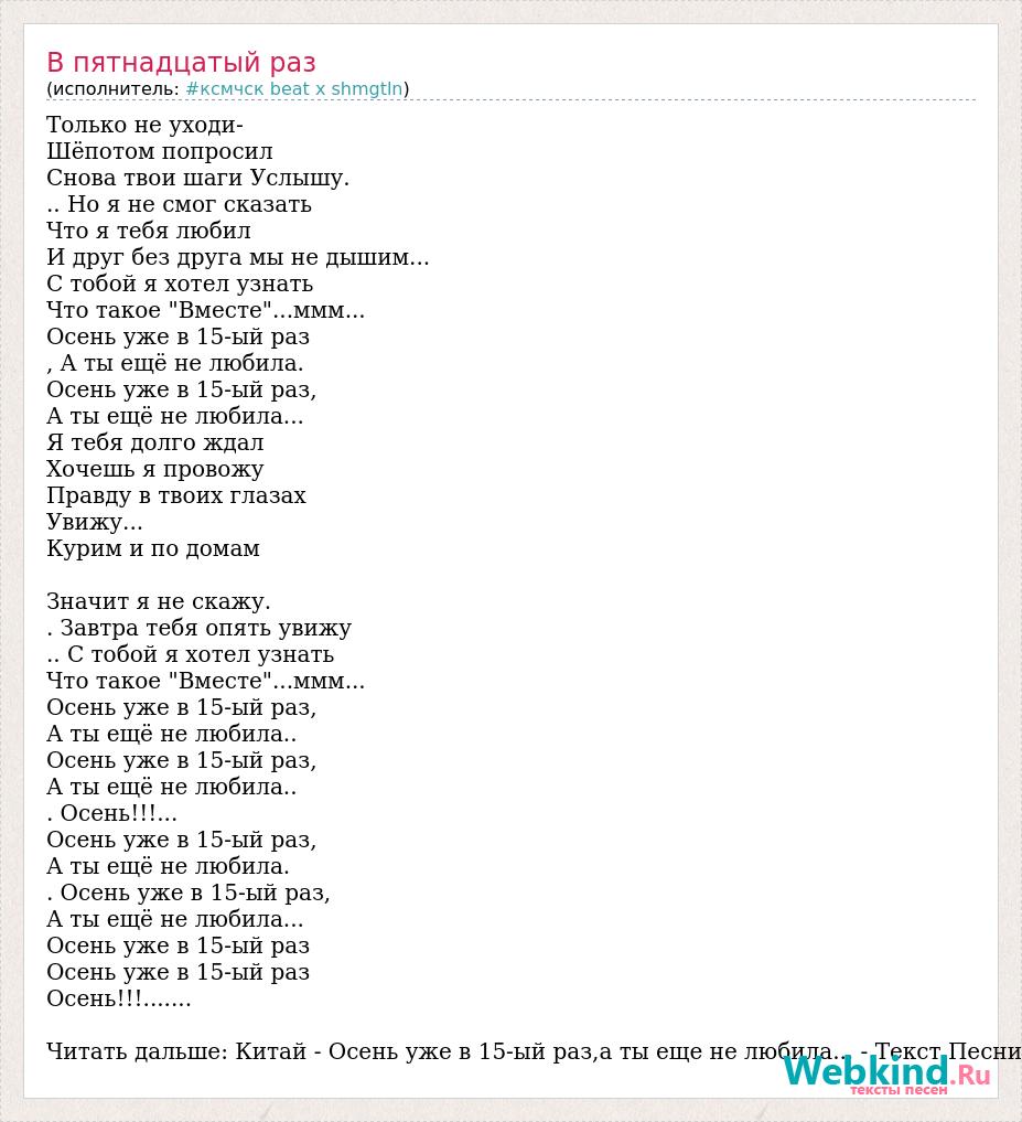 Только не уходи- Шёпотом попросил Снова твои шаги Услышу. .. Но я не смог сказать Что я тебя любил И друг без друга мы не дышим... С тобой я хотел узнать Что такое "Вместе"...ммм... Осень уже в 15-ый раз , А ты ещё не любила. Осень уже в 15-ый раз, А ты ещё не любила... Я тебя долго ждал Хочешь я провожу Правду в твоих глазах Увижу... Курим и по домам Значит я не скажу. . Завтра тебя опять увижу .. С тобой я хотел узнать Что такое "Вместе"...ммм... Осень уже в 15-ый раз, А ты ещё не любила.. Осень уже в 15-ый раз, А ты ещё не любила.. . Осень!!!... Осень уже в 15-ый раз, А ты ещё не любила. . Осень уже в 15-ый раз, А ты ещё не любила... Осень уже в 15-ый раз Осень уже в 15-ый раз Осень!!!....... Читать дальше: Китай - Осень уже в 15-ый раз,а ты еще не любила... - Текст Песни