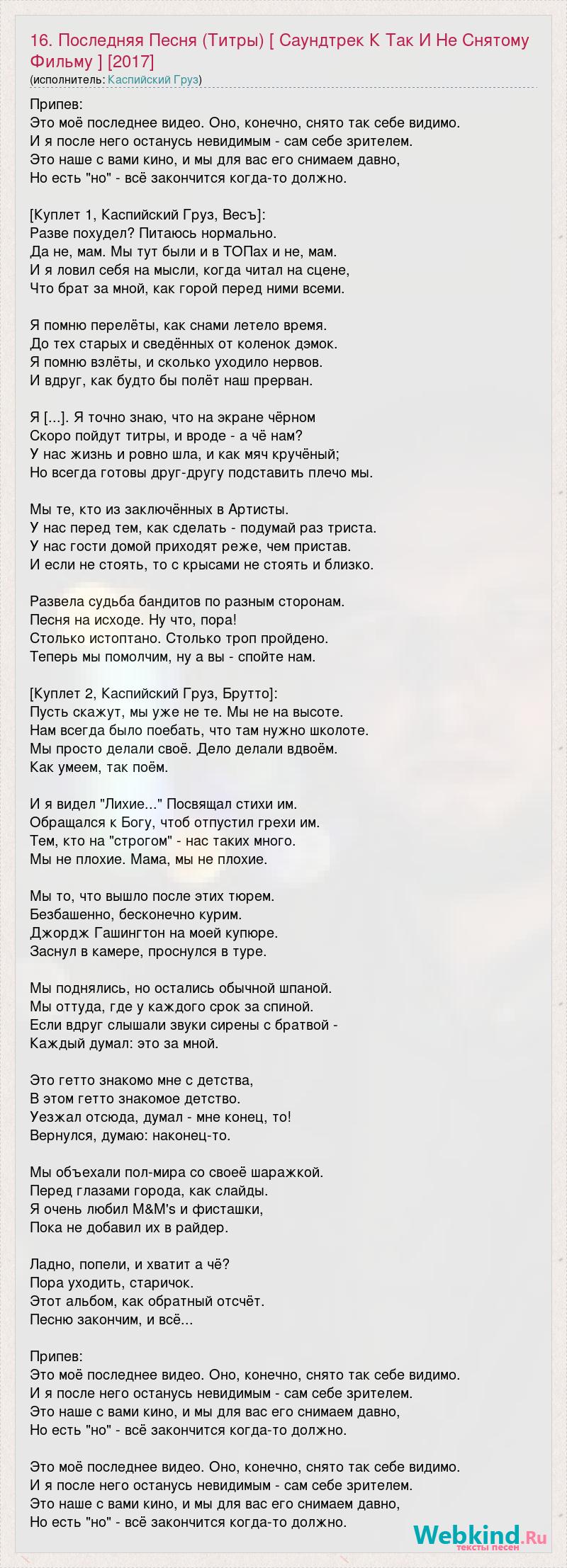Припев: Это моё последнее видео. Оно, конечно, снято так себе видимо. И я после него останусь невидимым - сам себе зрителем. Это наше с вами кино, и мы для вас его снимаем давно, Но есть "но" - всё закончится когда-то должно. [Куплет 1, Каспийский Груз, Весъ]: Разве похудел? Питаюсь нормально. Да не, мам. Мы тут были и в ТОПах и не, мам. И я ловил себя на мысли, когда читал на сцене, Что брат за мной, как горой перед ними всеми. Я помню перелёты, как снами летело время. До тех старых и сведённых от коленок дэмок. Я помню взлёты, и сколько уходило нервов. И вдруг, как будто бы полёт наш прерван. Я [...]. Я точно знаю, что на экране чёрном Скоро пойдут титры, и вроде - а чё нам? У нас жизнь и ровно шла, и как мяч кручёный; Но всегда готовы друг-другу подставить плечо мы. Мы те, кто из заключённых в Артисты. У нас перед тем, как сделать - подумай раз триста. У нас гости домой приходят реже, чем пристав. И если не стоять, то с крысами не стоять и близко. Развела судьба бандитов по разным сторонам. Песня на исходе. Ну что, пора! Столько истоптано. Столько троп пройдено. Теперь мы помолчим, ну а вы - спойте нам. [Куплет 2, Каспийский Груз, Брутто]: Пусть скажут, мы уже не те. Мы не на высоте. Нам всегда было поебать, что там нужно школоте. Мы просто делали своё. Дело делали вдвоём. Как умеем, так поём. И я видел "Лихие..." Посвящал стихи им. Обращался к Богу, чтоб отпустил грехи им. Тем, кто на "строгом" - нас таких много. Мы не плохие. Мама, мы не плохие. Мы то, что вышло после этих тюрем. Безбашенно, бесконечно курим. Джордж Гашингтон на моей купюре. Заснул в камере, проснулся в туре. Мы поднялись, но остались обычной шпаной. Мы оттуда, где у каждого срок за спиной. Если вдруг слышали звуки сирены с братвой - Каждый думал: это за мной. Это гетто знакомо мне с детства, В этом гетто знакомое детство. Уезжал отсюда, думал - мне конец, то! Вернулся, думаю: наконец-то. Мы объехали пол-мира со своеё шаражкой. Перед глазами города, как слайды. Я очень любил M&M's и фисташки, Пока не добавил их в райдер. Ладно, попели, и хватит а чё? Пора уходить, старичок. Этот альбом, как обратный отсчёт. Песню закончим, и всё... Припев: Это моё последнее видео. Оно, конечно, снято так себе видимо. И я после него останусь невидимым - сам себе зрителем. Это наше с вами кино, и мы для вас его снимаем давно, Но есть "но" - всё закончится когда-то должно. Это моё последнее видео. Оно, конечно, снято так себе видимо. И я после него останусь невидимым - сам себе зрителем. Это наше с вами кино, и мы для вас его снимаем давно, Но есть "но" - всё закончится когда-то должно.