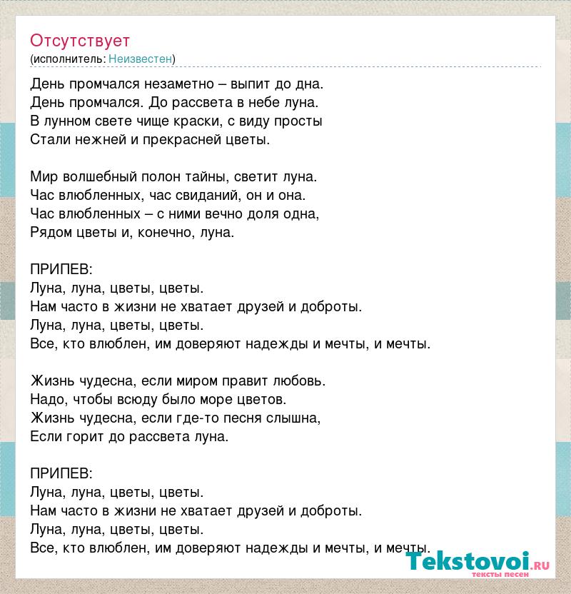 День промчался незаметно – выпит до дна. День промчался. До рассвета в небе луна. В лунном свете чище краски, с виду просты Стали нежней и прекрасней цветы. Мир волшебный полон тайны, светит луна. Час влюбленных, час свиданий, он и она. Час влюбленных – с ними вечно доля одна, Рядом цветы и, конечно, луна. ПРИПЕВ: Луна, луна, цветы, цветы. Нам часто в жизни не хватает друзей и доброты. Луна, луна, цветы, цветы. Все, кто влюблен, им доверяют надежды и мечты, и мечты. Жизнь чудесна, если миром правит любовь. Надо, чтобы всюду было море цветов. Жизнь чудесна, если где-то песня слышна, Если горит до рассвета луна. ПРИПЕВ: Луна, луна, цветы, цветы. Нам часто в жизни не хватает друзей и доброты. Луна, луна, цветы, цветы. Все, кто влюблен, им доверяют надежды и мечты, и мечты.