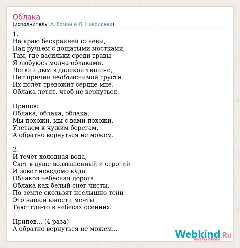 1. На краю бескрайней синевы, Над ручьем с дощатыми мостками, Там, где васильки среди травы Я любуюсь молча облаками. Легкий дым в далекой тишине, Нет причин необъяснимой грусти. Их полёт тревожит сердце мне. Облака летят, чтоб не вернуться. Припев: Облака, облака, облака, Мы похожи, мы с вами похожи. Улетаем к чужим берегам, А обратно вернуться не можем. 2. И течёт холодная вода, Свет в душе возвышенный и строгий И зовет неведомо куда Облаков небесная дорога. Облака как белый снег чисты, По земле скользят неслышно тени Это нашей юности мечты Тают где-то в небесах осенних. Припев... (4 раза) А обратно вернуться не можем...