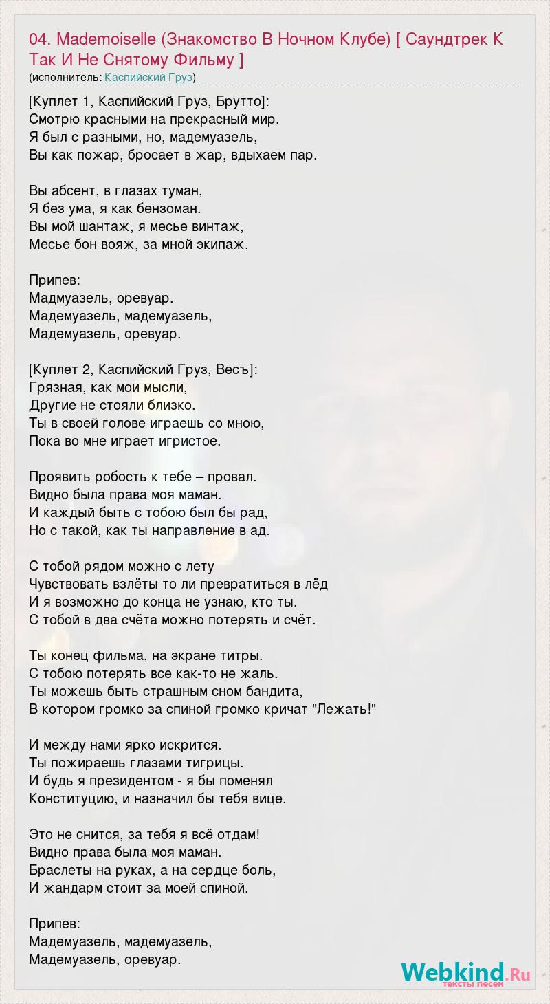 [Куплет 1, Каспийский Груз, Брутто]: Смотрю красными на прекрасный мир. Я был с разными, но, мадемуазель, Вы как пожар, бросает в жар, вдыхаем пар. Вы абсент, в глазах туман, Я без ума, я как бензоман. Вы мой шантаж, я месье винтаж, Месье бон вояж, за мной экипаж. Припев: Мадмуазель, оревуар. Мадемуазель, мадемуазель, Мадемуазель, оревуар. [Куплет 2, Каспийский Груз, Весъ]: Грязная, как мои мысли, Другие не стояли близко. Ты в своей голове играешь со мною, Пока во мне играет игристое. Проявить робость к тебе – провал. Видно была права моя маман. И каждый быть с тобою был бы рад, Но с такой, как ты направление в ад. С тобой рядом можно с лету Чувствовать взлёты то ли превратиться в лёд И я возможно до конца не узнаю, кто ты. С тобой в два счёта можно потерять и счёт. Ты конец фильма, на экране титры. С тобою потерять все как-то не жаль. Ты можешь быть страшным сном бандита, В котором громко за спиной громко кричат "Лежать!" И между нами ярко искрится. Ты пожираешь глазами тигрицы. И будь я президентом - я бы поменял Конституцию, и назначил бы тебя вице. Это не снится, за тебя я всё отдам! Видно права была моя маман. Браслеты на руках, а на сердце боль, И жандарм стоит за моей спиной. Припев: Мадемуазель, мадемуазель, Мадемуазель, оревуар.