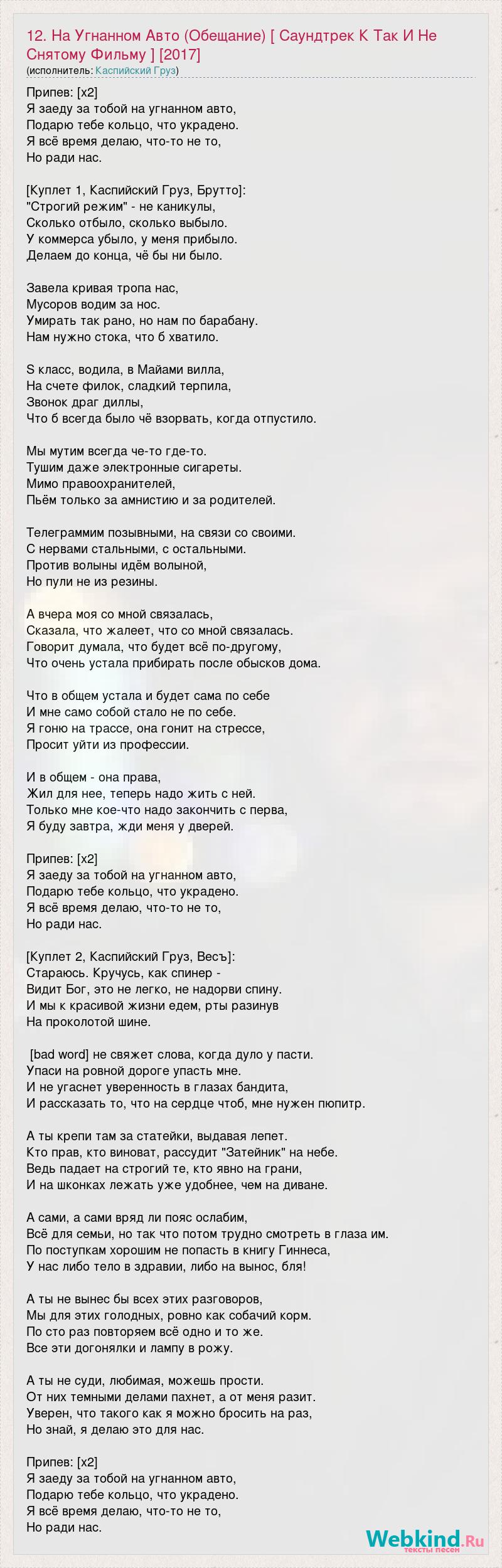 Припев: [x2] Я заеду за тобой на угнанном авто, Подарю тебе кольцо, что украдено. Я всё время делаю, что-то не то, Но ради нас. [Куплет 1, Каспийский Груз, Брутто]: "Строгий режим" - не каникулы, Сколько отбыло, сколько выбыло. У коммерса убыло, у меня прибыло. Делаем до конца, чё бы ни было. Завела кривая тропа нас, Мусоров водим за нос. Умирать так рано, но нам по барабану. Нам нужно стока, что б хватило. S класс, водила, в Майами вилла, На счете филок, сладкий терпила, Звонок драг диллы, Что б всегда было чё взорвать, когда отпустило. Мы мутим всегда че-то где-то. Тушим даже электронные сигареты. Мимо правоохранителей, Пьём только за амнистию и за родителей. Телеграммим позывными, на связи со своими. С нервами стальными, с остальными. Против волыны идём волыной, Но пули не из резины. А вчера моя со мной связалась, Сказала, что жалеет, что со мной связалась. Говорит думала, что будет всё по-другому, Что очень устала прибирать после обысков дома. Что в общем устала и будет сама по себе И мне само собой стало не по себе. Я гоню на трассе, она гонит на стрессе, Просит уйти из профессии. И в общем - она права, Жил для нее, теперь надо жить с ней. Только мне кое-что надо закончить с перва, Я буду завтра, жди меня у дверей. Припев: [x2] Я заеду за тобой на угнанном авто, Подарю тебе кольцо, что украдено. Я всё время делаю, что-то не то, Но ради нас. [Куплет 2, Каспийский Груз, Весъ]: Стараюсь. Кручусь, как спинер - Видит Бог, это не легко, не надорви спину. И мы к красивой жизни едем, рты разинув На проколотой шине. [bad word] не свяжет слова, когда дуло у пасти. Упаси на ровной дороге упасть мне. И не угаснет уверенность в глазах бандита, И рассказать то, что на сердце чтоб, мне нужен пюпитр. А ты крепи там за статейки, выдавая лепет. Кто прав, кто виноват, рассудит "Затейник" на небе. Ведь падает на строгий те, кто явно на грани, И на шконках лежать уже удобнее, чем на диване. А сами, а сами вряд ли пояс ослабим, Всё для семьи, но так что потом трудно смотреть в глаза им. По поступкам хорошим не попасть в книгу Гиннеса, У нас либо тело в здравии, либо на вынос, бля! А ты не вынес бы всех этих разговоров, Мы для этих голодных, ровно как собачий корм. По сто раз повторяем всё одно и то же. Все эти догонялки и лампу в рожу. А ты не суди, любимая, можешь прости. От них темными делами пахнет, а от меня разит. Уверен, что такого как я можно бросить на раз, Но знай, я делаю это для нас. Припев: [x2] Я заеду за тобой на угнанном авто, Подарю тебе кольцо, что украдено. Я всё время делаю, что-то не то, Но ради нас.