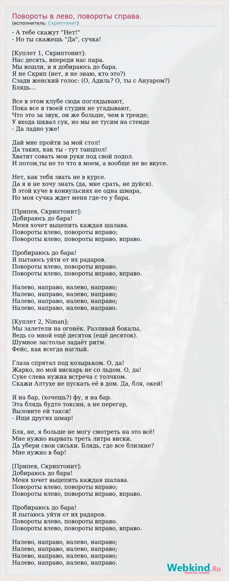 - А тебе скажут "Нет!" - Но ты скажешь "Да", сучка! [Куплет 1, Скриптонит]: Нас десять, впереди нас пара. Мы вошли, и я добираюсь до бара. Я не Скрип (нет, я не знаю, кто это?) Сзади женский голос: (О, Адиль? О, ты с Ануаром?) Блядь... Все в этом клубе сюда поглядывают, Пока все в твоей студии не угадывают, Что это за звук, он же больше, чем в тренде; У входа шквал сук, но мы не тусим на стенде - Да ладно уже! Дай мне пройти за мой стол! Да таких, как ты - тут танцпол! Хватит совать мои руки под свой подол. И потом,ты не то что в моем, а вообще не во вкусе. Нет, как тебя звать не в курсе. Да я и не хочу знать (да, мне срать, не дуйся). В этой куче в конвульсиях не одна шмара, Но моя сучка ждет меня где-то у бара. [Припев, Скриптонит]: Добираюсь до бара! Меня хочет выцепить каждая шалава. Повороты влево, повороты вправо; Повороты влево, повороты вправо, вправо. Пробираюсь до бара! Я пытаюсь уйти от их радаров. Повороты влево, повороты вправо. Повороты влево, повороты вправо, вправо. Налево, направо, налево, направо; Налево, направо, налево, направо; Налево, направо, налево, направо; Налево, направо, налево, направо. [Куплет 2, Niman]: Мы залетели на огонёк. Разливай бокалы, Ведь со мной ещё десяток (ещё десяток). Шумное застолье задаёт ритм. Фейс, как всегда наглый. Глаза спрятал под козырьком. О, да! Жарко, но мой вискарь не со льдом. О, да! Суке слева нужна встреча с толчком. Скажи Алтухе не пускать её в дом. Да, бля, окей! Я на бар, (хочешь?) фу, я на бар. Эта блядь будто токсин, а не перегар, Вызовите ей такси! - Ищи других шмар! Бля, не, я больше не могу смотреть на это всё! Мне нужно вырвать треть литра виски. Да убери свои сиськи. Блядь, где все близкие? Мне нужно в бар! [Припев, Скриптонит]: Добираюсь до бара! Меня хочет выцепить каждая шалава. Повороты влево, повороты вправо; Повороты влево, повороты вправо, вправо. Пробираюсь до бара! Я пытаюсь уйти от их радаров. Повороты влево, повороты вправо. Повороты влево, повороты вправо, вправо. Налево, направо, налево, направо; Налево, направо, налево, направо; Налево, направо, налево, направо; Налево, направо, налево, направо.