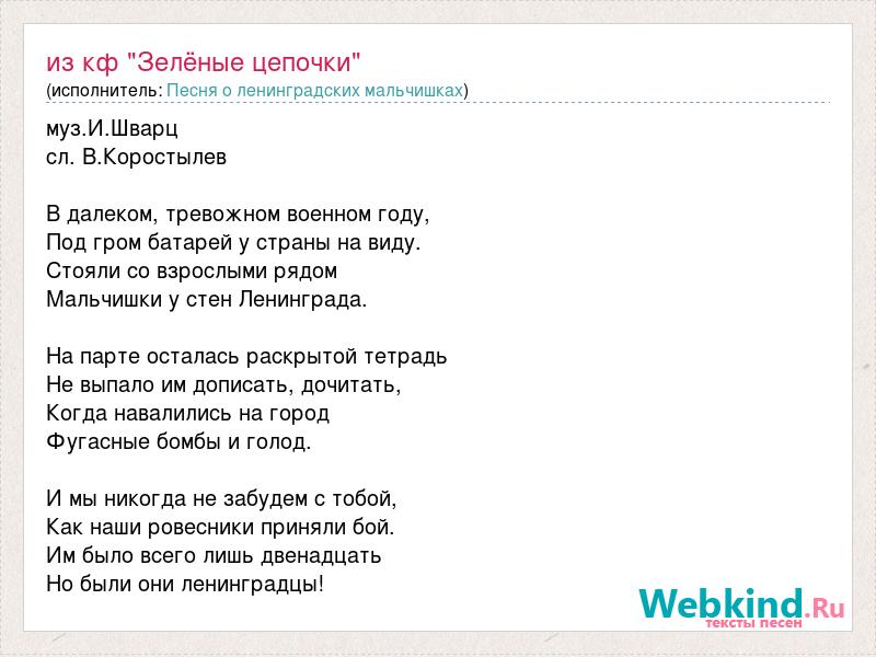 муз.И.Шварц сл. В.Коростылев В далеком, тревожном военном году, Под гром батарей у страны на виду. Стояли со взрослыми рядом Мальчишки у стен Ленинграда. На парте осталась раскрытой тетрадь Не выпало им дописать, дочитать, Когда навалились на город Фугасные бомбы и голод. И мы никогда не забудем с тобой, Как наши ровесники приняли бой. Им было всего лишь двенадцать Но были они ленинградцы!