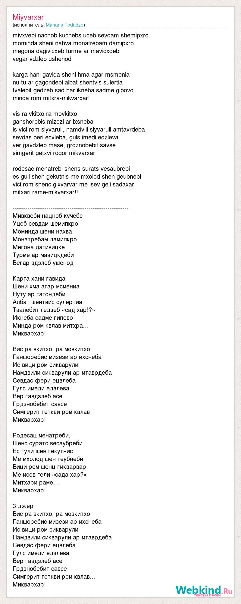 mivxvebi nacnob kuchebs uceb sevdam shemipxro mominda sheni nahva monatrebam damipxro megona dagivicxeb turme ar mavicxdebi vegar vdzleb ushenod karga hani gavida sheni hma agar msmenia nu tu ar gagondebi albat shentvis sulertia tvalebit gedzeb sad har ikneba sadme gipovo minda rom mitxra-mikvarxar! vis ra vkitxo ra movkitxo ganshorebis mizezi ar ixsneba is vici rom siyvaruli, namdvili siyvaruli amtavrdeba sevdas peri ecvleba, guls imedi edzleva ver gavdzleb mase, grdznobebit savse simgerit getxvi rogor mikvarxar rodesac menatrebi shens surats vesaubrebi es guli shen gekutnis me mxolod shen geubnebi vici rom shenc gixvarvar me isev geli sadaxar mitxari rame-mikvarxar!! ------------------------------------------------------- Мивквеби нацноб кучебс Уцеб севдам шемипкро Моминда шени нахва Монатребам дамипкро Мегона дагивицке Турме ар мавицкдеби Вегар вдзлеб ушенод Карга хани гавида Шени хма агар мсмениа Нуту ар гагондеби Албат шентвис сулертиа Твалебит гедзеб «сад хар!?» Икнеба садме гипово Минда ром квлав митхра… Миквархар! Вис ра вкитхо, ра мовкитхо Ганшоребис мизези ар ихснеба Ис вици ром сикварули Намдвили сикварули ар мтаврдеба Севдас фери ецвлеба Гулс имеди едзлева Вер гавдзлеб асе Грдзнобебит савсе Симгерит геткви ром квлав Миквархар! Родесац менатреби, Шенс суратс весаубреби Ес гули шен гекутнис Ме мхолод шен геубнеби Вици ром шенц гикварвар Ме исев гели «сада хар?» Митхари раме… Миквархар! 3 джер Вис ра вкитхо, ра мовкитхо Ганшоребис мизези ар ихснеба Ис вици ром сикварули Намдвили сикварули ар мтаврдеба Севдас фери ецвлеба Гулс имеди едзлева Вер гавдзлеб асе Грдзнобебит савсе Симгерит геткви ром квлав… Миквархар!