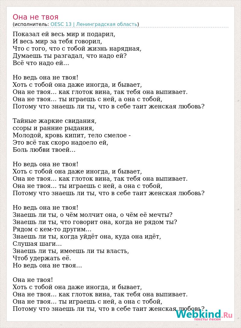 Показал ей весь мир и подарил, И весь мир за тебя говорил, Что с того, что с тобой жизнь нарядная, Думаешь ты разгадал, что надо ей? Всё что надо ей… Но ведь она не твоя! Хоть с тобой она даже иногда, и бывает, Она не твоя… как глоток вина, так тебя она выпивает. Она не твоя… ты играешь с ней, а она с тобой, Потому что знаешь ли ты, что в себе таит женская любовь? Тайные жаркие свидания, ссоры и ранние рыдания, Молодой, кровь кипит, тело смелое - Это всё так скоро надоело ей, Боль любви твоей… Но ведь она не твоя! Хоть с тобой она даже иногда, и бывает, Она не твоя… как глоток вина, так тебя она выпивает. Она не твоя… ты играешь с ней, а она с тобой, Потому что знаешь ли ты, что в себе таит женская любовь? Но ведь она не твоя! Знаешь ли ты, о чём молчит она, о чём её мечты? Знаешь ли ты, что говорит она, когда не рядом ты? Рядом с кем-то другим… Знаешь ли ты, когда уйдёт она, куда она идёт, Слушая шаги… Знаешь ли ты, имеешь ли ты власть, Чтоб удержать её. Но ведь она не твоя… Она не твоя! Хоть с тобой она даже иногда, и бывает, Она не твоя… как глоток вина, так тебя она выпивает. Она не твоя… ты играешь с ней, а она с тобой, Потому что знаешь ли ты, что в себе таит женская любовь?