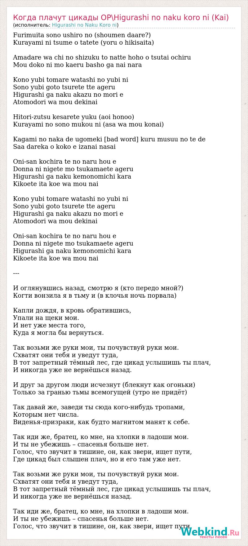 Furimuita sono ushiro no (shoumen daare?) Kurayami ni tsume o tatete (yoru o hikisaita) Amadare wa chi no shizuku to natte hoho o tsutai ochiru Mou doko ni mo kaeru basho ga nai nara Kono yubi tomare watashi no yubi ni Sono yubi goto tsurete tte ageru Higurashi ga naku akazu no mori e Atomodori wa mou dekinai Hitori-zutsu kesarete yuku (aoi honoo) Kurayami no sono mukou ni (asa wa mou konai) Kagami no naka de ugomeki [bad word] kuru musuu no te de Saa dareka o koko e izanai nasai Oni-san kochira te no naru hou e Donna ni nigete mo tsukamaete ageru Higurashi ga naku kemonomichi kara Kikoete ita koe wa mou nai Kono yubi tomare watashi no yubi ni Sono yubi goto tsurete tte ageru Higurashi ga naku akazu no mori e Atomodori wa mou dekinai Oni-san kochira te no naru hou e Donna ni nigete mo tsukamaete ageru Higurashi ga naku kemonomichi kara Kikoete ita koe wa mou nai --- И оглянувшись назад, смотрю я (кто передо мной?) Когти вонзила я в тьму и (в клочья ночь порвала) Капли дождя, в кровь обратившись, Упали на щеки мои. И нет уже места того, Куда я могла бы вернуться. Так возьми же руки мои, ты почувствуй руки мои. Схватят они тебя и уведут туда, В тот запретный тёмный лес, где цикад услышишь ты плач, И никогда уже не вернёшься назад. И друг за другом люди исчезнут (блекнут как огоньки) Только за гранью тьмы всемогущей (утро не придёт) Так давай же, заведи ты сюда кого-нибудь тропами, Которым нет числа. Виденья-призраки, как будто магнитом манят к себе. Так иди же, братец, ко мне, на хлопки в ладоши мои. И ты не убежишь – спасенья больше нет. Голос, что звучит в тишине, он, как звери, ищет пути, Где цикад был слышен плач, но и его там уже нет. Так возьми же руки мои, ты почувствуй руки мои. Схватят они тебя и уведут туда, В тот запретный тёмный лес, где цикад услышишь ты плач, И никогда уже не вернёшься назад. Так иди же, братец, ко мне, на хлопки в ладоши мои. И ты не убежишь – спасенья больше нет. Голос, что звучит в тишине, он, как звери, ищет пути