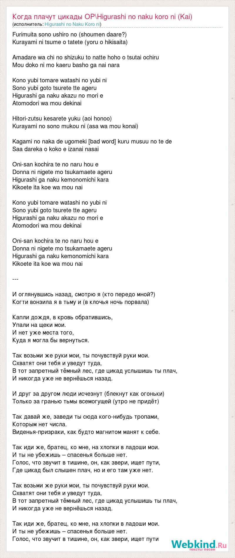 Furimuita sono ushiro no (shoumen daare?) Kurayami ni tsume o tatete (yoru o hikisaita) Amadare wa chi no shizuku to natte hoho o tsutai ochiru Mou doko ni mo kaeru basho ga nai nara Kono yubi tomare watashi no yubi ni Sono yubi goto tsurete tte ageru Higurashi ga naku akazu no mori e Atomodori wa mou dekinai Hitori-zutsu kesarete yuku (aoi honoo) Kurayami no sono mukou ni (asa wa mou konai) Kagami no naka de ugomeki [bad word] kuru musuu no te de Saa dareka o koko e izanai nasai Oni-san kochira te no naru hou e Donna ni nigete mo tsukamaete ageru Higurashi ga naku kemonomichi kara Kikoete ita koe wa mou nai Kono yubi tomare watashi no yubi ni Sono yubi goto tsurete tte ageru Higurashi ga naku akazu no mori e Atomodori wa mou dekinai Oni-san kochira te no naru hou e Donna ni nigete mo tsukamaete ageru Higurashi ga naku kemonomichi kara Kikoete ita koe wa mou nai --- И оглянувшись назад, смотрю я (кто передо мной?) Когти вонзила я в тьму и (в клочья ночь порвала) Капли дождя, в кровь обратившись, Упали на щеки мои. И нет уже места того, Куда я могла бы вернуться. Так возьми же руки мои, ты почувствуй руки мои. Схватят они тебя и уведут туда, В тот запретный тёмный лес, где цикад услышишь ты плач, И никогда уже не вернёшься назад. И друг за другом люди исчезнут (блекнут как огоньки) Только за гранью тьмы всемогущей (утро не придёт) Так давай же, заведи ты сюда кого-нибудь тропами, Которым нет числа. Виденья-призраки, как будто магнитом манят к себе. Так иди же, братец, ко мне, на хлопки в ладоши мои. И ты не убежишь – спасенья больше нет. Голос, что звучит в тишине, он, как звери, ищет пути, Где цикад был слышен плач, но и его там уже нет. Так возьми же руки мои, ты почувствуй руки мои. Схватят они тебя и уведут туда, В тот запретный тёмный лес, где цикад услышишь ты плач, И никогда уже не вернёшься назад. Так иди же, братец, ко мне, на хлопки в ладоши мои. И ты не убежишь – спасенья больше нет. Голос, что звучит в тишине, он, как звери, ищет пути