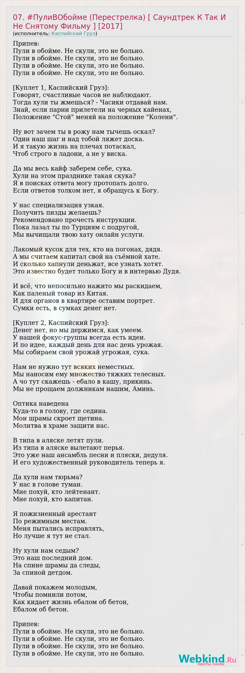 Припев: Пули в обойме. Не скули, это не больно. Пули в обойме. Не скули, это не больно. Пули в обойме. Не скули, это не больно. Пули в обойме. Не скули, это не больно. [Куплет 1, Каспийский Груз]: Говорят, счастливые часов не наблюдают. Тогда хули ты жмешься? - Часики отдавай нам. Знай, если парни прилетели на черных кайенах, Положение "Стой" меняй на положение "Колени". Ну вот зачем ты в рожу нам тычешь оскал? Один наш шаг и над тобой ляжет доска. И я такую жизнь на плечах потаскал, Чтоб строго в ладони, а не у виска. Да мы весь кайф заберем себе, сука. Хули на этом празднике такая скука? Я в поисках ответа могу протопать долго. Если ответов толком нет, я обращусь к Богу. У нас специализация узкая. Получить пизды желаешь? Рекомендовано прочесть инструкции. Пока лазал ты по Турциям с подругой, Мы вычищали твою хату онлайн услуги. Лакомый кусок для тех, кто на погонах, дядя. А мы считаем капитал свой на съёмной хате. И сколько хапнули деньжат, все узнать хотят. Это известно будет только Богу и в интервью Дудя. И всё, что непосильно нажито мы раскидаем, Как паленый товар из Китая. И для органов в квартире оставим портрет. Сумки есть, в сумках денег нет. [Куплет 2, Каспийский Груз]: Денег нет, но мы держимся, как умеем. У нашей фокус-группы всегда есть идеи. И по идее, каждый день для нас день урожая. Мы собираем свой урожай угрожая, сука. Нам не нужно тут всяких неместных. Мы наносим ему множество тяжких телесных. А чо тут скажешь - ебало в кашу, прикинь. Мы не прощаем должникам нашим, Аминь. Оптика наведена Куда-то в голову, где седина. Мои шрамы скроет щетина. Молитва в храме защити нас. В типа в аляске летят пули. Из типа в аляске вылетают перья. Это уже наш ансамбль песни и пляски, дедуля. И его художественный руководитель теперь я. Да хули нам тюрьма? У нас в голове туман. Мне похуй, кто лейтенант. Мне похуй, кто капитан. Я пожизненный арестант По режимным местам. Меня пытались исправлять, Но лучше я тут не стал. Ну хули нам седым? Это наш последний дом. На спине шрамы да следы, За спиной детдом. Давай покажем молодым, Чтобы помнили потом, Как кидает жизнь ебалом об бетон, Ебалом об бетон. Припев: Пули в обойме. Не скули, это не больно. Пули в обойме. Не скули, это не больно. Пули в обойме. Не скули, это не больно. Пули в обойме. Не скули, это не больно.