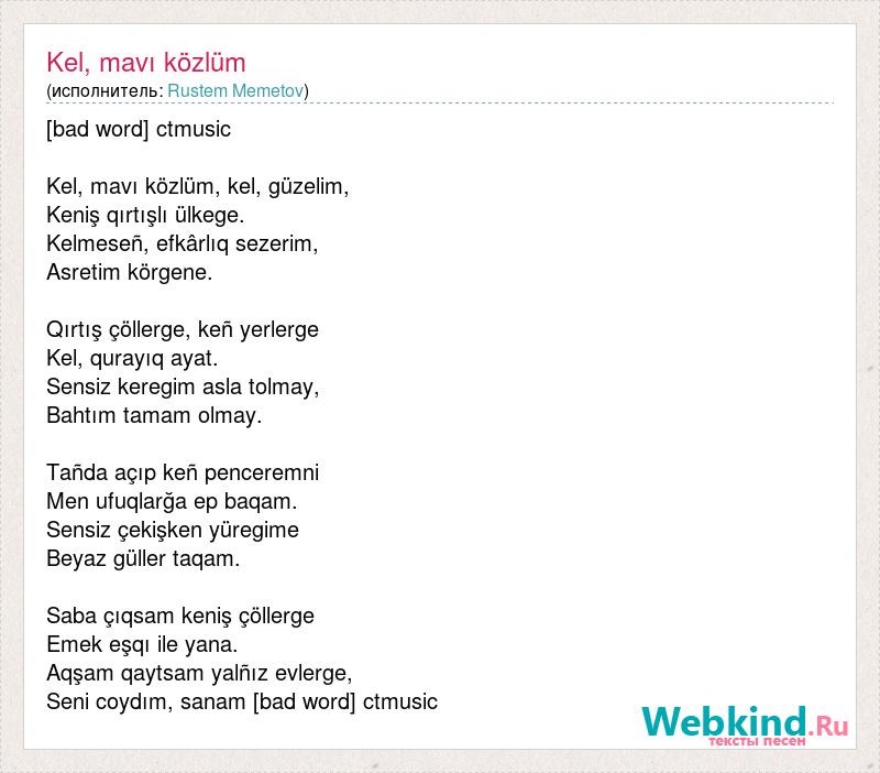 [bad word] ctmusic Kel, mavı közlüm, kel, güzelim, Keniş qırtışlı ülkege. Kelmeseñ, efkârlıq sezerim, Asretim körgene. Qırtış çöllerge, keñ yerlerge Kel, qurayıq ayat. Sensiz keregim asla tolmay, Bahtım tamam olmay. Tañda açıp keñ penceremni Men ufuqlarğa ep baqam. Sensiz çekişken yüregime Beyaz güller taqam. Saba çıqsam keniş çöllerge Emek eşqı ile yana. Aqşam qaytsam yalñız evlerge, Seni coydım, sanam [bad word] ctmusic
