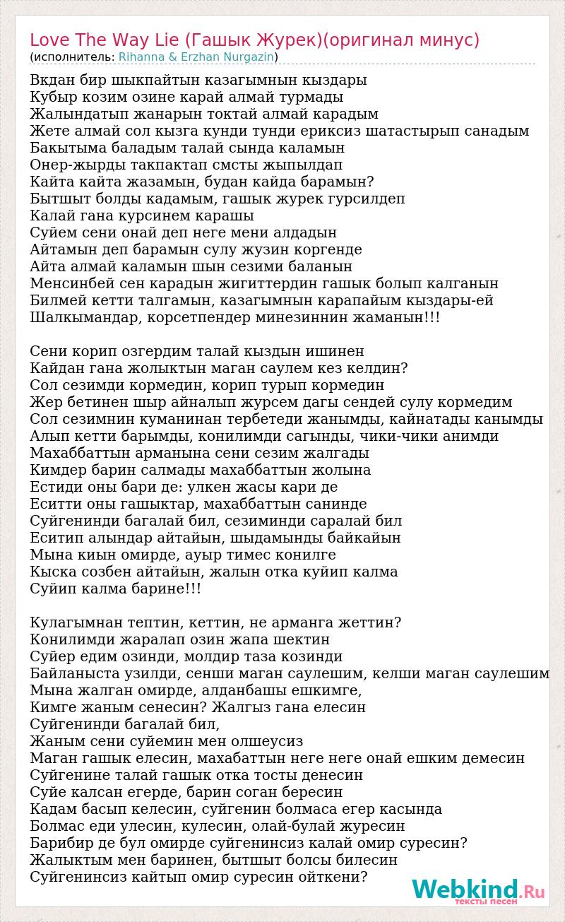 Вкдан бир шыкпайтын казагымнын кыздары Кубыр козим озине карай алмай турмады Жалындатып жанарын токтай алмай карадым Жете алмай сол кызга кунди тунди ериксиз шатастырып санадым Бакытыма баладым талай сында каламын Онер-жырды такпактап смсты жыпылдап Кайта кайта жазамын, будан кайда барамын? Бытшыт болды кадамым, гашык журек гурсилдеп Калай гана курсинем карашы Суйем сени онай деп неге мени алдадын Айтамын деп барамын сулу жузин коргенде Айта алмай каламын шын сезими баланын Менсинбей сен карадын жигиттердин гашык болып калганын Билмей кетти талгамын, казагымнын карапайым кыздары-ей Шалкымандар, корсетпендер минезиннин жаманын!!! Сени корип озгердим талай кыздын ишинен Кайдан гана жолыктын маган саулем кез келдин? Сол сезимди кормедин, корип турып кормедин Жер бетинен шыр айналып журсем дагы сендей сулу кормедим Сол сезимнин куманинан тербетеди жанымды, кайнатады канымды Алып кетти барымды, конилимди сагынды, чики-чики анимди Махаббаттын арманына сени сезим жалгады Кимдер барин салмады махаббаттын жолына Естиди оны бари де: улкен жасы кари де Еситти оны гашыктар, махаббаттын санинде Суйгенинди багалай бил, сезиминди саралай бил Еситип алындар айтайын, шыдамынды байкайын Мына киын омирде, ауыр тимес конилге Кыска созбен айтайын, жалын отка куйип калма Суйип калма барине!!! Кулагымнан тептин, кеттин, не арманга жеттин? Конилимди жаралап озин жапа шектин Суйер едим озинди, молдир таза козинди Байланыста узилди, сенши маган саулешим, келши маган саулешим Мына жалган омирде, алданбашы ешкимге, Кимге жаным сенесин? Жалгыз гана елесин Суйгенинди багалай бил, Жаным сени суйемин мен олшеусиз Маган гашык елесин, махабаттын неге неге онай ешким демесин Суйгенине талай гашык отка тосты денесин Суйе калсан егерде, барин соган бересин Кадам басып келесин, суйгенин болмаса егер касында Болмас еди улесин, кулесин, олай-булай журесин Барибир де бул омирде суйгенинсиз калай омир суресин? Жалыктым мен баринен, бытшыт болсы билесин Суйгенинсиз кайтып омир суресин ойткени?