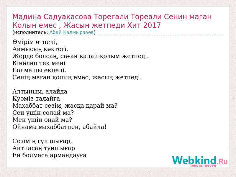 Главная→Исполнители→Абай Калмырзаев→Мадина Садуакасова Торегали Тореали Сенин маган Колын емес , Жасын жетпеди Хит