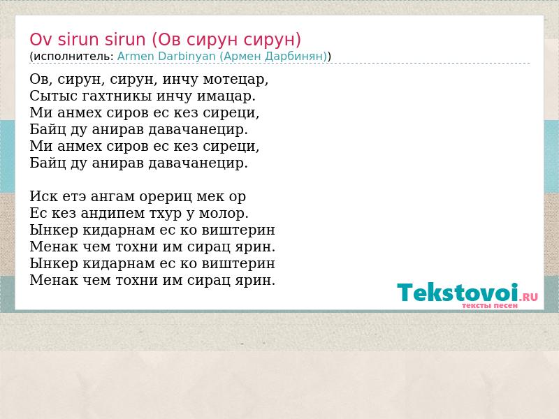 Ов, сирун, сирун, инчу мотецар, Сытыс гахтникы инчу имацар. Ми анмех сиров ес кез сиреци, Байц ду анирав давачанецир. Ми анмех сиров ес кез сиреци, Байц ду анирав давачанецир. Иск етэ ангам орериц мек ор Ес кез андипем тхур у молор. Ынкер кидарнам ес ко виштерин Менак чем тохни им сирац ярин. Ынкер кидарнам ес ко виштерин Менак чем тохни им сирац ярин.
