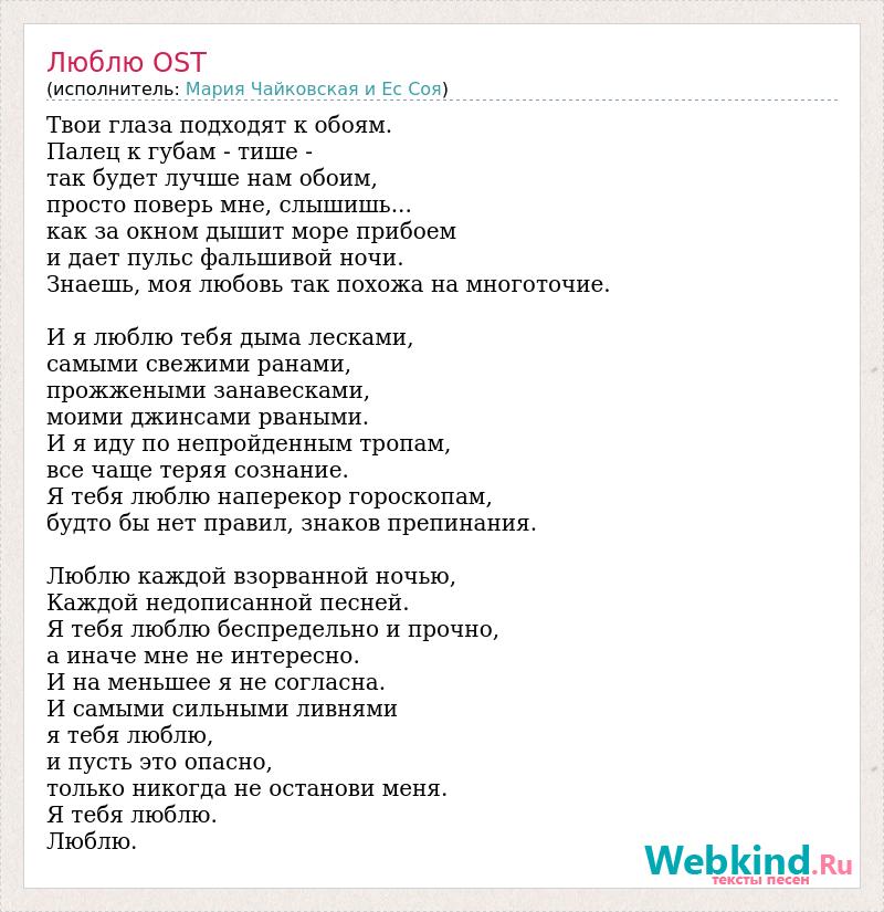 Твои глаза подходят к обоям. Палец к губам - тише - так будет лучше нам обоим, просто поверь мне, слышишь... как за окном дышит море прибоем и дает пульс фальшивой ночи. Знаешь, моя любовь так похожа на многоточие. И я люблю тебя дыма лесками, самыми свежими ранами, прожжеными занавесками, моими джинсами рваными. И я иду по непройденным тропам, все чаще теряя сознание. Я тебя люблю наперекор гороскопам, будто бы нет правил, знаков препинания. Люблю каждой взорванной ночью, Каждой недописанной песней. Я тебя люблю беспредельно и прочно, а иначе мне не интересно. И на меньшее я не согласна. И самыми сильными ливнями я тебя люблю, и пусть это опасно, только никогда не останови меня. Я тебя люблю. Люблю.