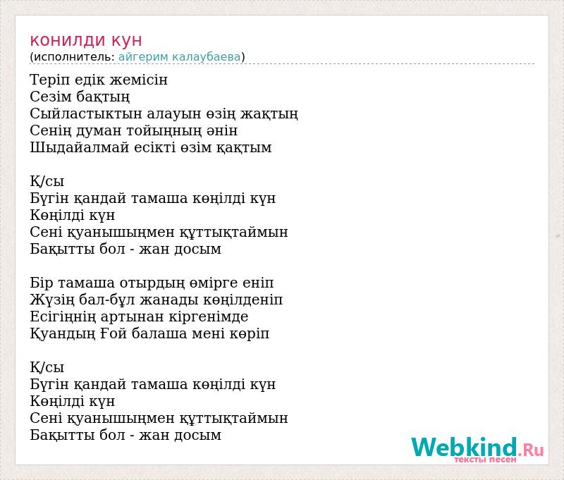 Теріп едік жемісін Сезім бақтың Сыйластыктын алауын өзің жақтың Сенің думан тойыңның әнін Шыдайалмай есікті өзім қақтым Қ/сы Бүгін қандай тамаша көңілді күн Көңілді күн Сені қуанышыңмен құттықтаймын Бақытты бол - жан досым Бір тамаша отырдың өмірге еніп Жүзің бал-бұл жанады көңілденіп Есігіңнің артынан кіргенімде Қуандың Ғой балаша мені көріп Қ/сы Бүгін қандай тамаша көңілді күн Көңілді күн Сені қуанышыңмен құттықтаймын Бақытты бол - жан досым