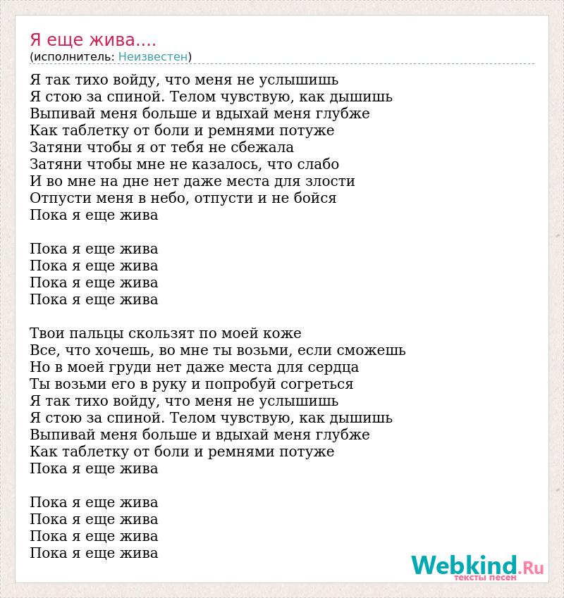 Я так тихо войду, что меня не услышишь Я стою за спиной. Телом чувствую, как дышишь Выпивай меня больше и вдыхай меня глубже Как таблетку от боли и ремнями потуже Затяни чтобы я от тебя не сбежала Затяни чтобы мне не казалось, что слабо И во мне на дне нет даже места для злости Отпусти меня в небо, отпусти и не бойся Пока я еще жива Пока я еще жива Пока я еще жива Пока я еще жива Пока я еще жива Твои пальцы скользят по моей коже Все, что хочешь, во мне ты возьми, если сможешь Но в моей груди нет даже места для сердца Ты возьми его в руку и попробуй согреться Я так тихо войду, что меня не услышишь Я стою за спиной. Телом чувствую, как дышишь Выпивай меня больше и вдыхай меня глубже Как таблетку от боли и ремнями потуже Пока я еще жива Пока я еще жива Пока я еще жива Пока я еще жива Пока я еще жива