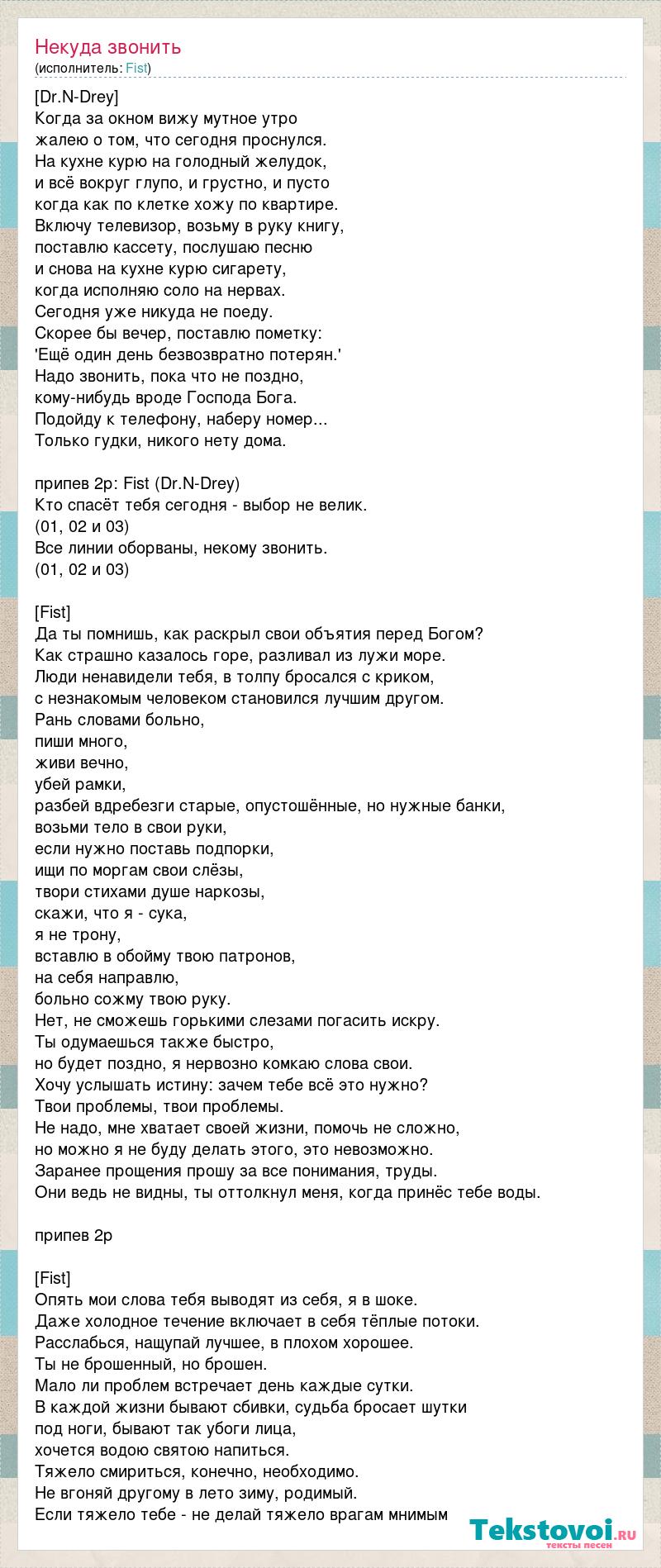 [Dr.N-Drey] Когда за окном вижу мутное утро жалею о том, что сегодня проснулся. На кухне курю на голодный желудок, и всё вокруг глупо, и грустно, и пусто когда как по клетке хожу по квартире. Включу телевизор, возьму в руку книгу, поставлю кассету, послушаю песню и снова на кухне курю сигарету, когда исполняю соло на нервах. Сегодня уже никуда не поеду. Скорее бы вечер, поставлю пометку: 'Ещё один день безвозвратно потерян.' Надо звонить, пока что не поздно, кому-нибудь вроде Господа Бога. Подойду к телефону, наберу номер... Только гудки, никого нету дома. припев 2р: Fist (Dr.N-Drey) Кто спасёт тебя сегодня - выбор не велик. (01, 02 и 03) Все линии оборваны, некому звонить. (01, 02 и 03) [Fist] Да ты помнишь, как раскрыл свои объятия перед Богом? Как страшно казалось горе, разливал из лужи море. Люди ненавидели тебя, в толпу бросался с криком, с незнакомым человеком становился лучшим другом. Рань словами больно, пиши много, живи вечно, убей рамки, разбей вдребезги старые, опустошённые, но нужные банки, возьми тело в свои руки, если нужно поставь подпорки, ищи по моргам свои слёзы, твори стихами душе наркозы, скажи, что я - сука, я не трону, вставлю в обойму твою патронов, на себя направлю, больно сожму твою руку. Нет, не сможешь горькими слезами погасить искру. Ты одумаешься также быстро, но будет поздно, я нервозно комкаю слова свои. Хочу услышать истину: зачем тебе всё это нужно? Твои проблемы, твои проблемы. Не надо, мне хватает своей жизни, помочь не сложно, но можно я не буду делать этого, это невозможно. Заранее прощения прошу за все понимания, труды. Они ведь не видны, ты оттолкнул меня, когда принёс тебе воды. припев 2р [Fist] Опять мои слова тебя выводят из себя, я в шоке. Даже холодное течение включает в себя тёплые потоки. Расслабься, нащупай лучшее, в плохом хорошее. Ты не брошенный, но брошен. Мало ли проблем встречает день каждые сутки. В каждой жизни бывают сбивки, судьба бросает шутки под ноги, бывают так убоги лица, хочется водою святою напиться. Тяжело смириться, конечно, необходимо. Не вгоняй другому в лето зиму, родимый. Если тяжело тебе - не делай тяжело врагам мнимым